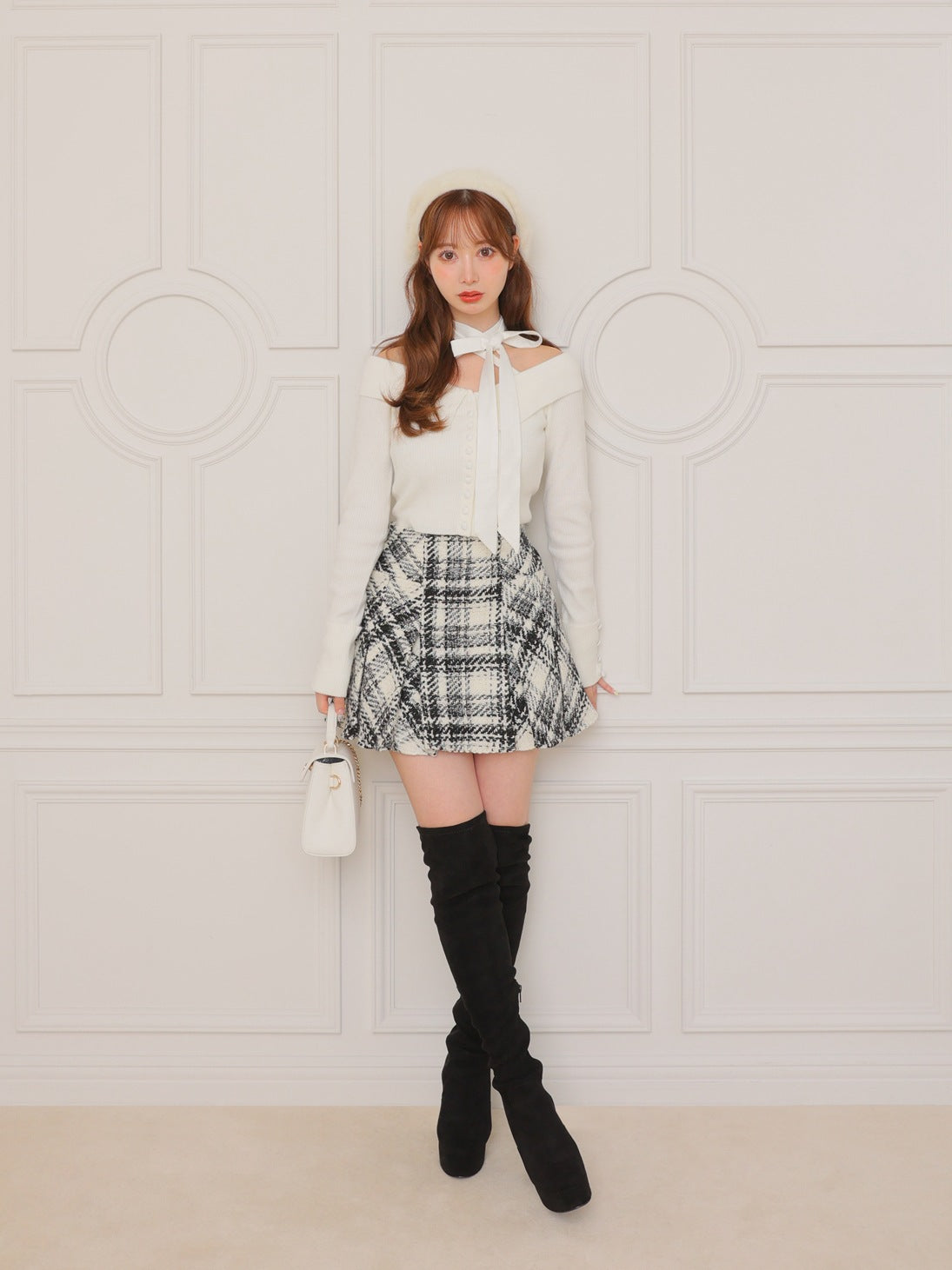 ホワイト(チェックツイード) 本体:ポリエステル100% ブラック(ベロア) 本体:ポリエステル90%、ポリウレタン10% |