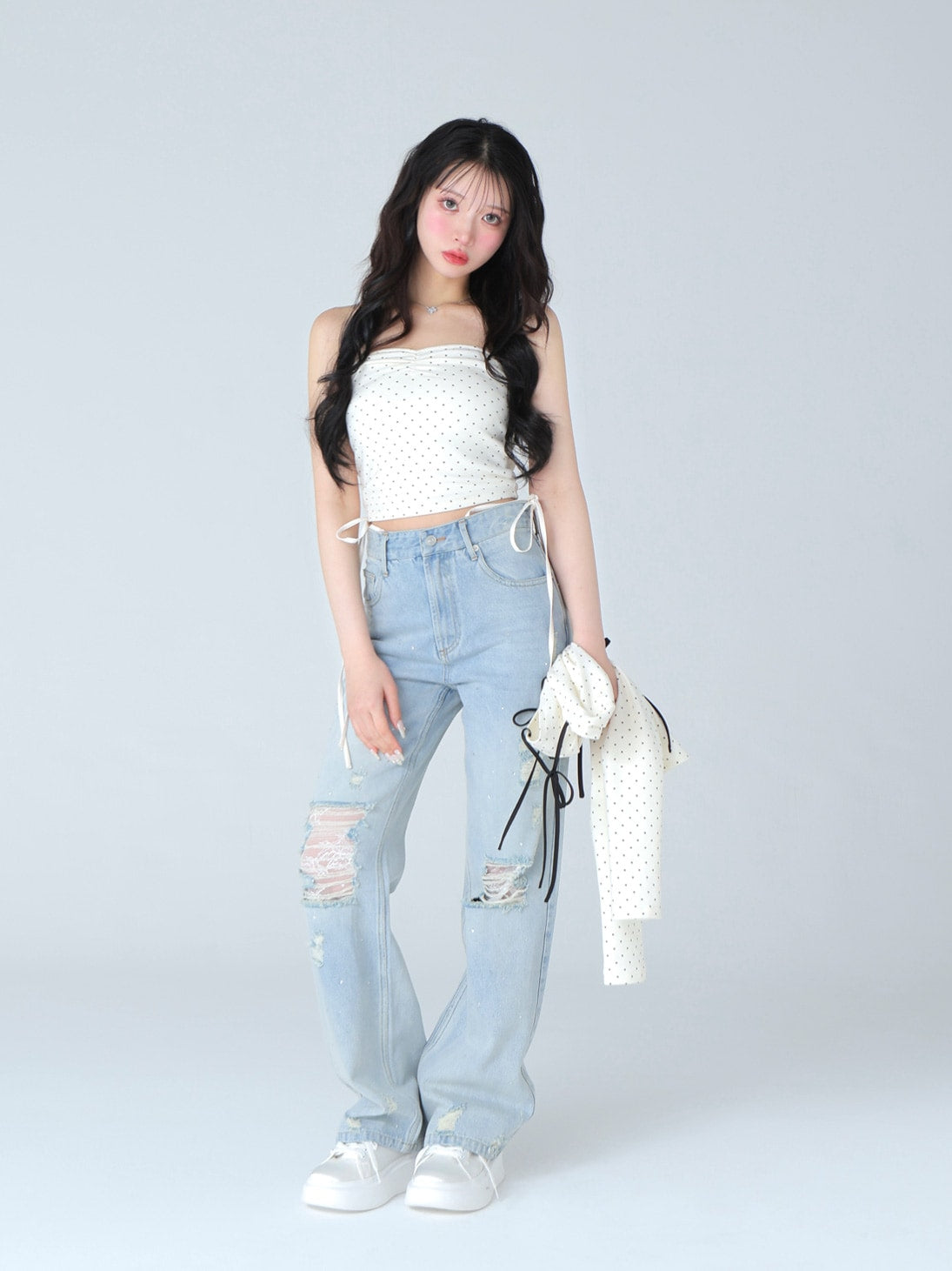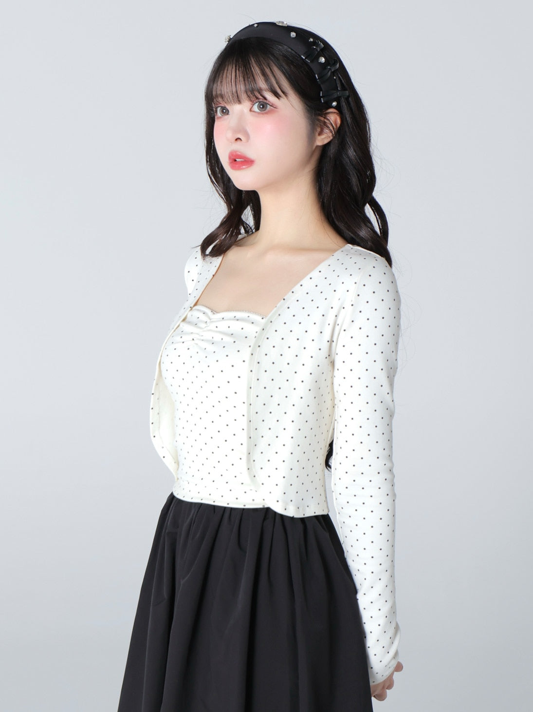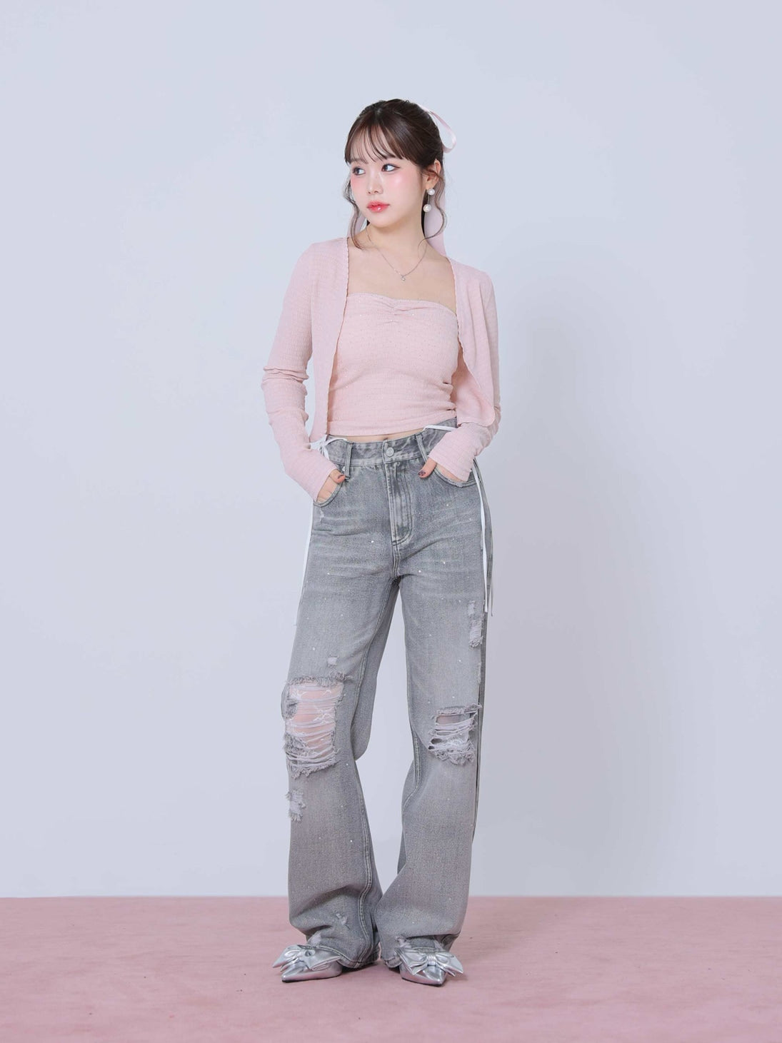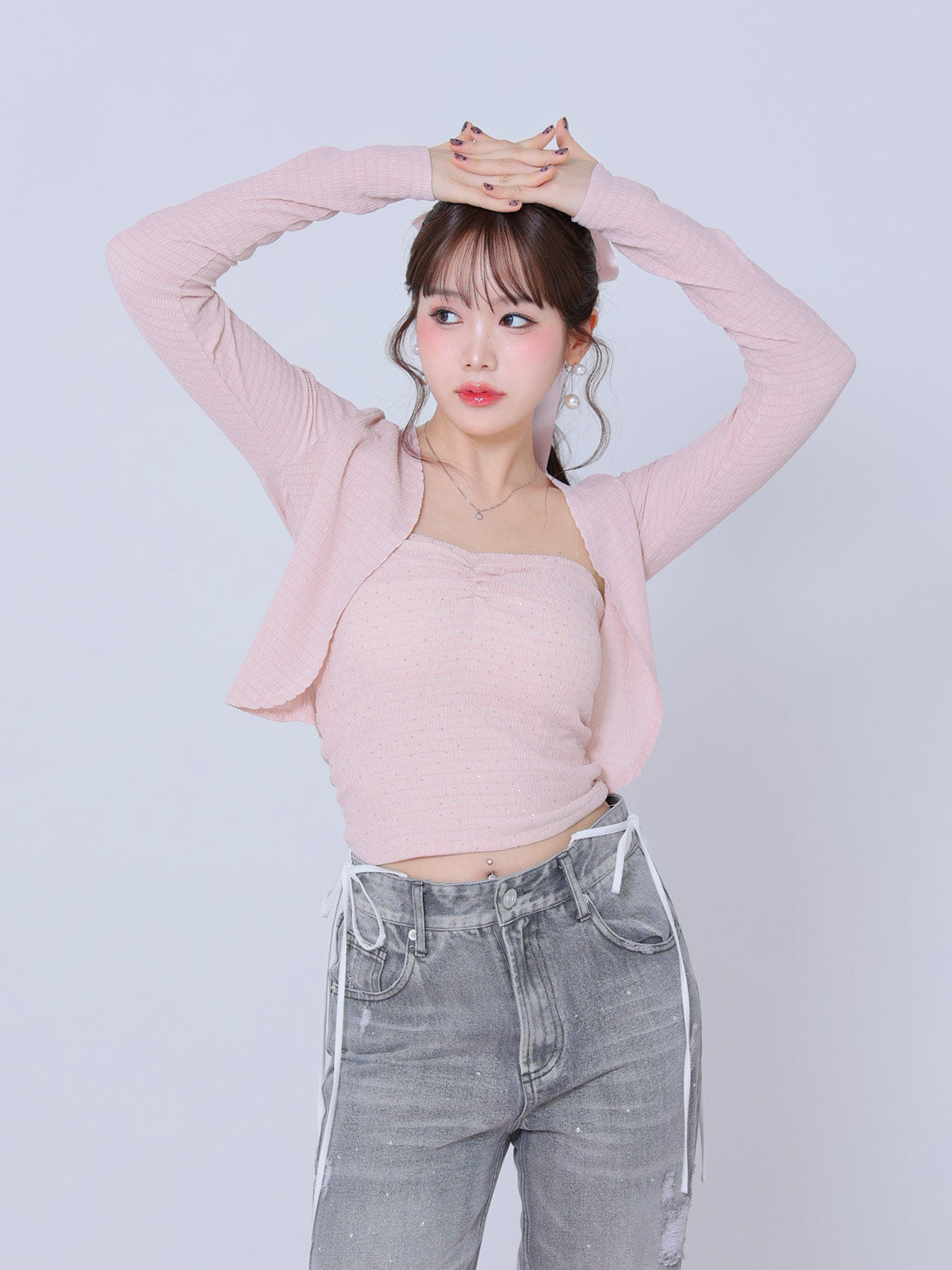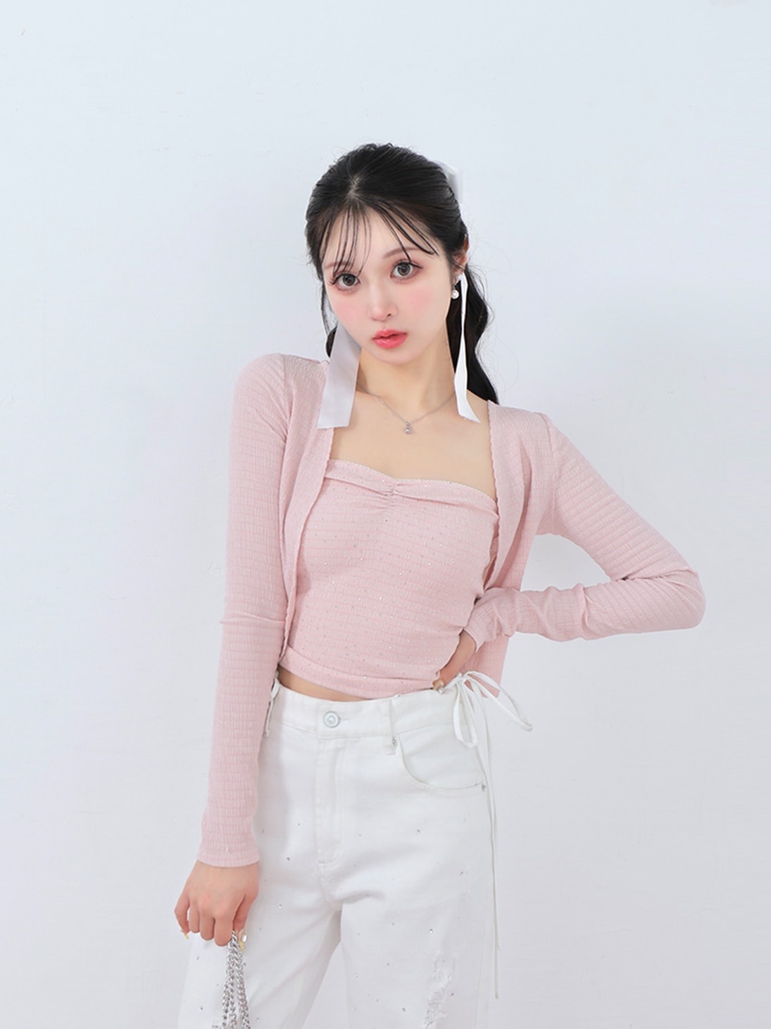 トレンド感のあるカーディガンとインナーのアンサンブルアイテム。短丈のカーディガンは、後ろに並んだ三つのリボンがポイント。インナーはベアトップで、重ねた時にデコルテがきれいに見えるデザインに仕上げました。それぞれ単品でも活用いただけるアイテムです。セットでご着用いただくことで、いつものパンツ合わせも、大人のカジュアルスタイルへと導きます。生地はカラーごとに質感の違う素材を使用しています。パっと目を惹くドット柄は、もっちりとしたカット素材でこれからの季節にぴったり。ピンクは凹凸のあるリップル生地で、身体のラインを拾い過ぎずに女性らしさを引き出してくれます。ピンクのベアトップにのみフロントにビジューが付いております。