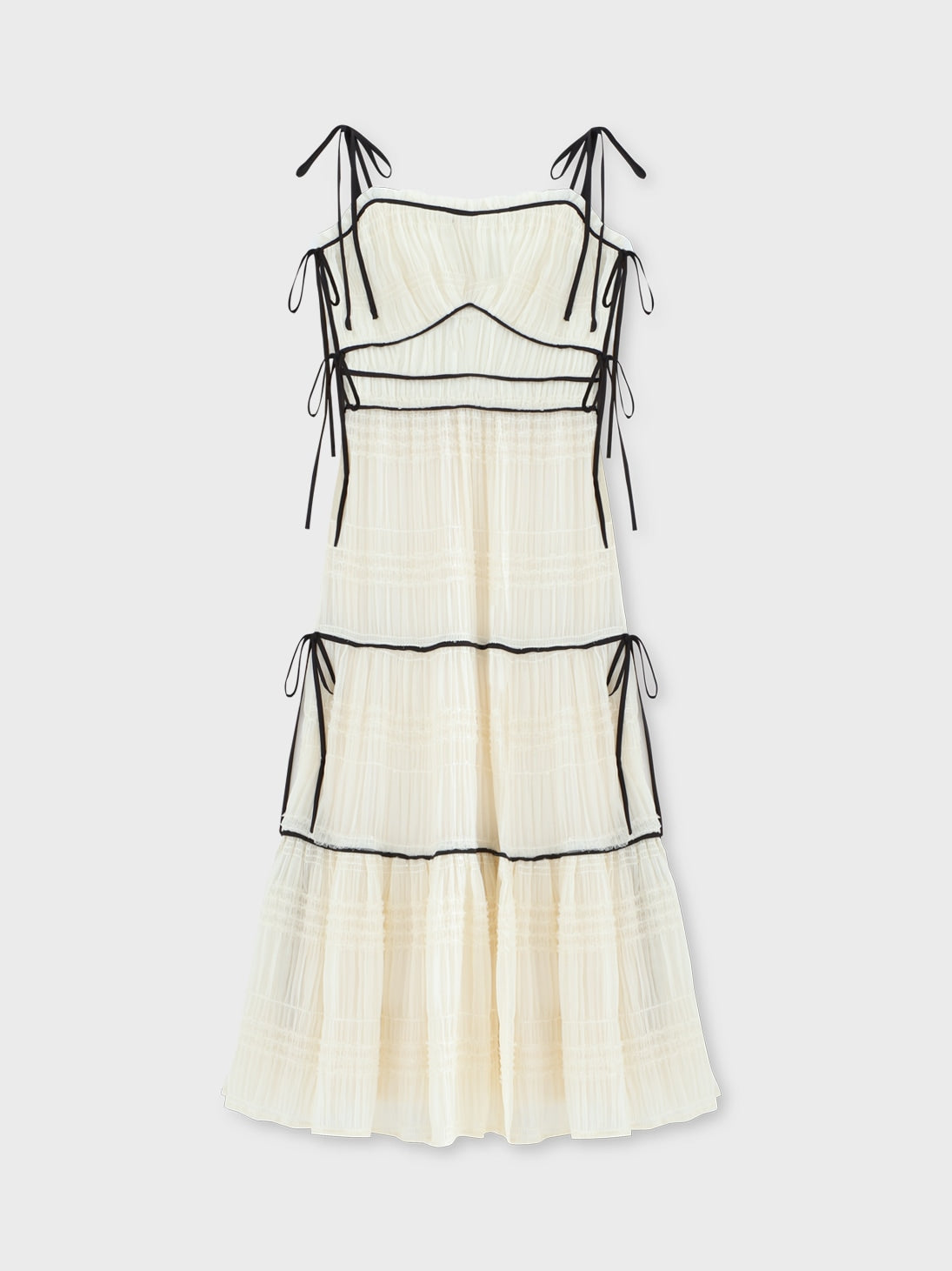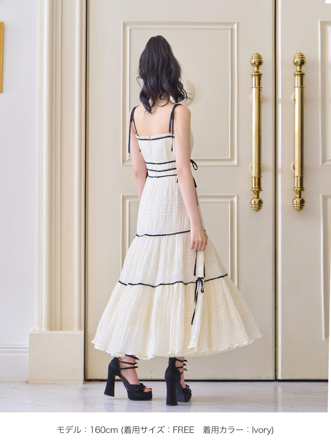 細やかなフリルとシャーリングの入ったシフォン素材でお作りしたキャミソール型ワンピース。配色パイピングを加えてメリハリを出し、ウエストのシェイプ位置は高めに設定することでスタイルアップを叶えます。胸元は顔まわりを優しく魅せるフリル、女性らしい丸みのある立体感をギャザーで演出。裾の動きが華やかな切り替えデザイン、サイドに並んだ細リボンで甘さと特別感を後押し。肩とサイドに施したリボンは、固定されているので解けてしまう心配はありません。生地にはスパンコールが入っているため、歩くたびに程よい光沢感が目を惹きます。特別な日にはもちろん、リゾートやたくさん動き回る日にもおすすめです。