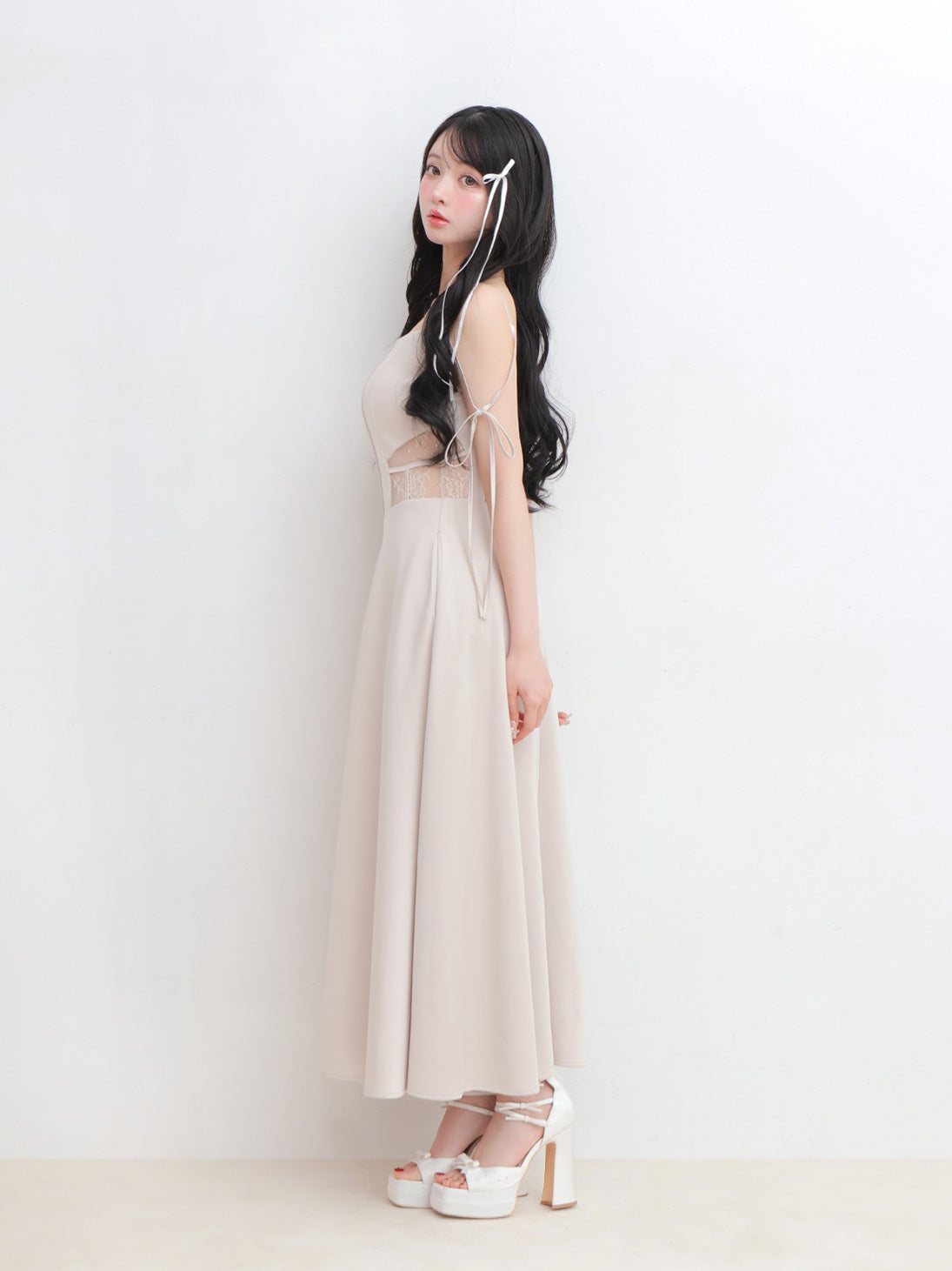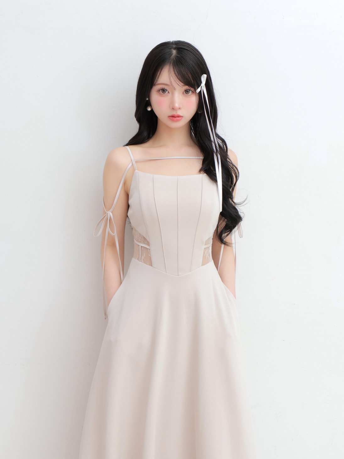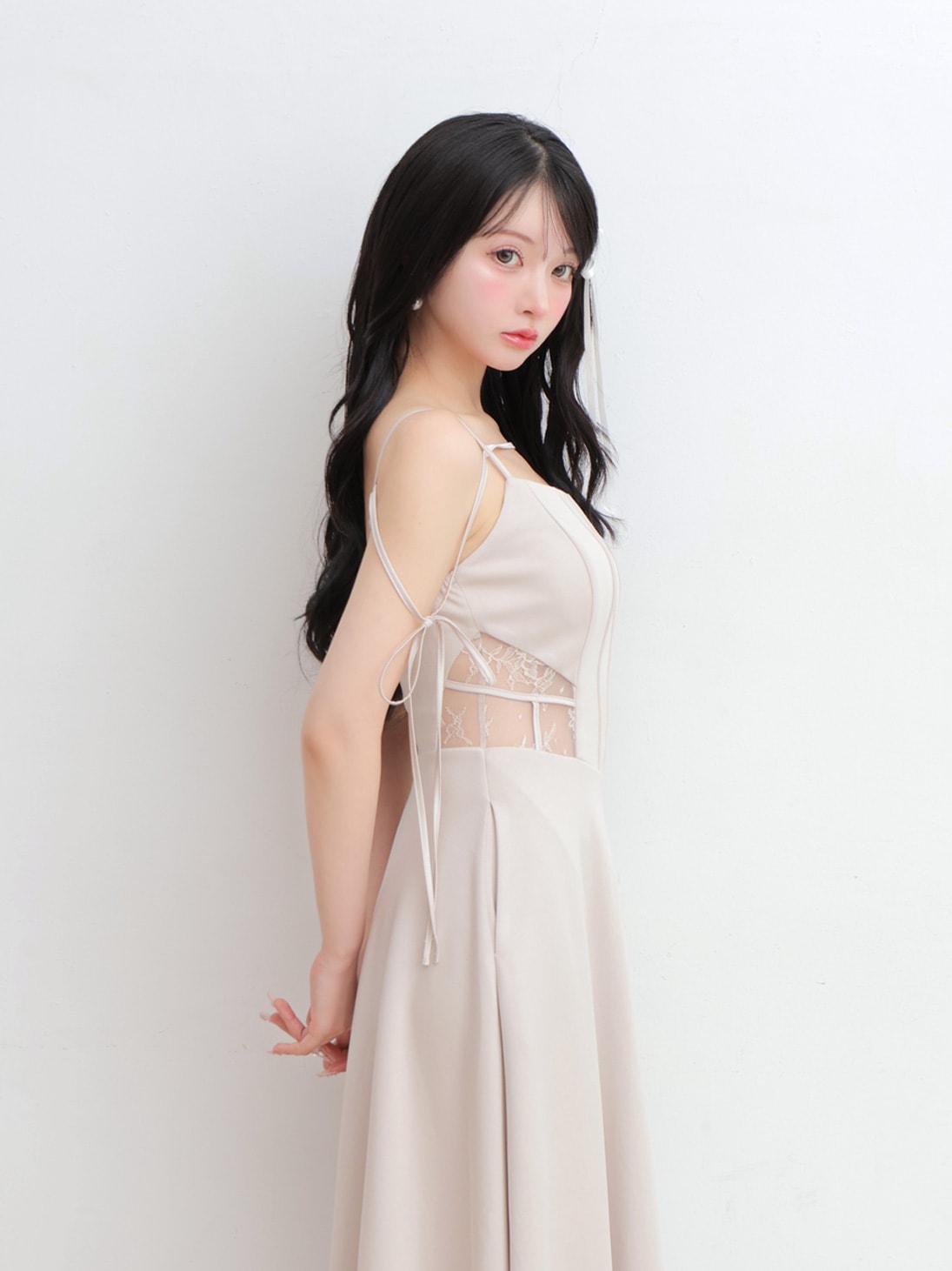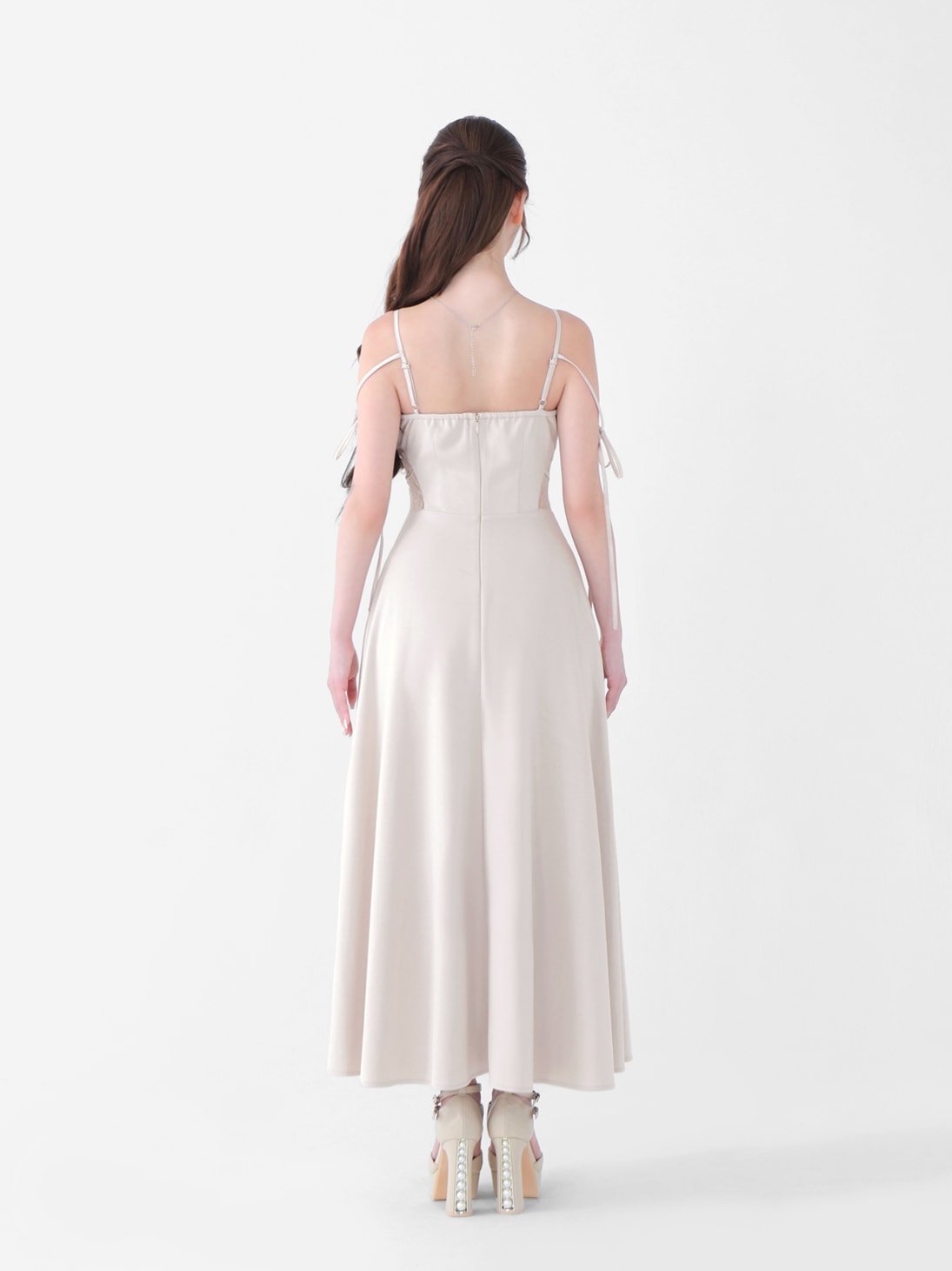 デコルテ周りには華奢ストラップで魅せる、上品な肌見せデザイン。