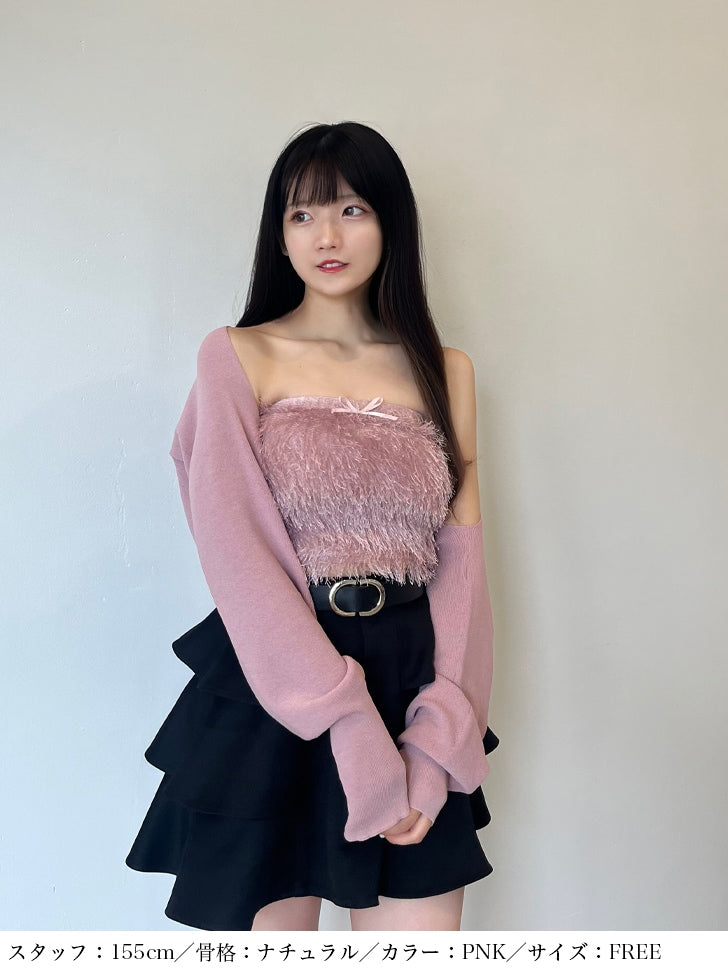 いつものスタイリングを瞬時に華やかにしてくれる主役級のアイテム。カットフェザーのベアは、ボリュームがありながら軽い着心地が魅力。バスト部分は安心のゴム入り、パットとストラップは取り外しが可能です。ボレロはさらっとした、通気性の良い生地感。真夏もご着用いただけます。デニムやワイドパンツ、ミニスカートなど幅広いアイテムと相性抜群。
