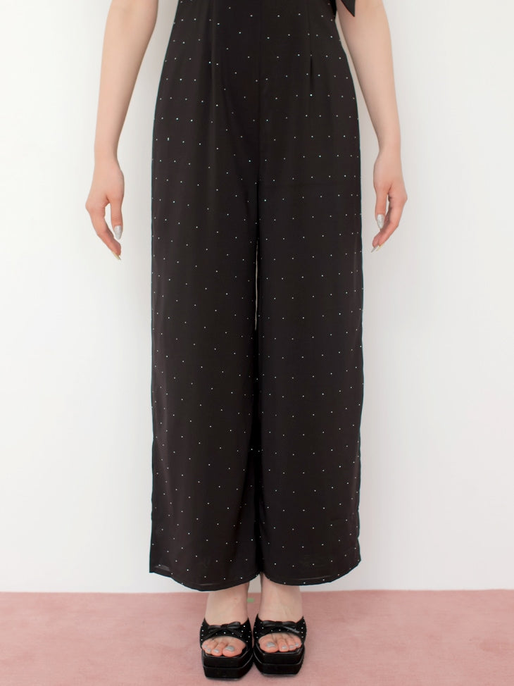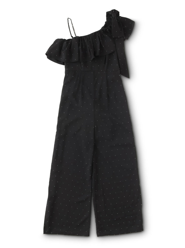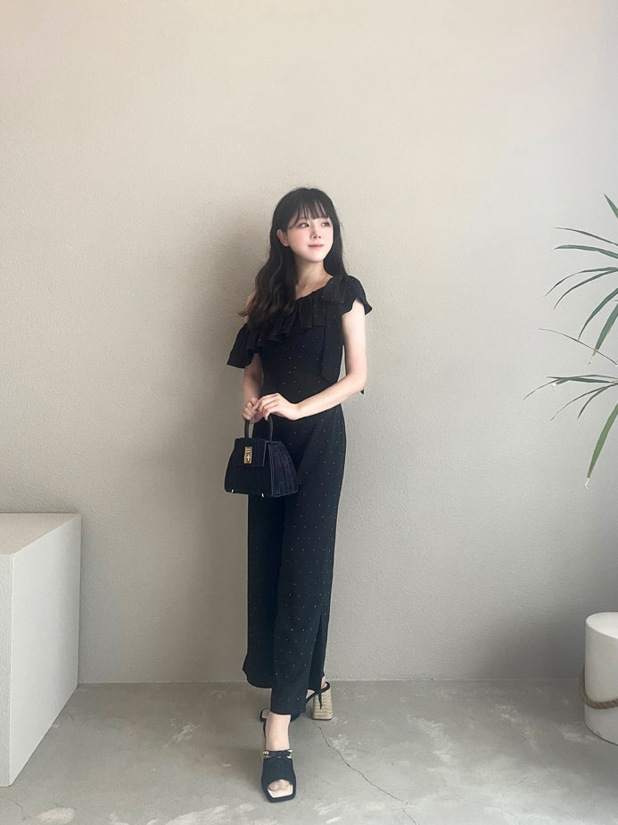 アシンメトリーなワンショルデザインで、ヘルシーに肌見せ。ボリュームフリルが肩まわりや二の腕をカバーし、華奢に見せてくれます。生地は柔らかく涼しい、夏にぴったりなシフォン素材。小さいスタッズをドット柄に散りばめ、動く度に輝く1枚に仕上げました。高めの位置でシェイプしたウエスト×裾に向かって緩やかに広がるワイドシルエットは、体のラインをスラッと真っ直ぐに見せてくれる。着るだけでスタイルアップが叶います。ビジューを施した肩ストラップは長さの調整が可能。リボンは固定されていているため、綺麗なままの形をキープします。