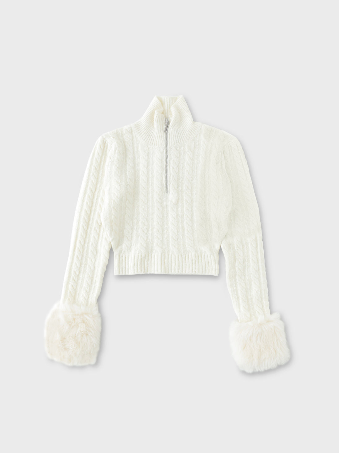 袖口にはニットと同色のファーを施し、高級感のある雰囲気に仕上げました。ファーは取り外しができるため、シンプルなニットとしても着ていただけます。ハーフジップは閉めてハイネックとして着用したり、開けてデコルテを見せたりと、スタイリングの幅を広げてくれる1枚です。丈短なので、ハイウエストのアイテムやミニスカートなどボリュームのあるボトムスと合わせると、よりスタイルアップして着こなせます。