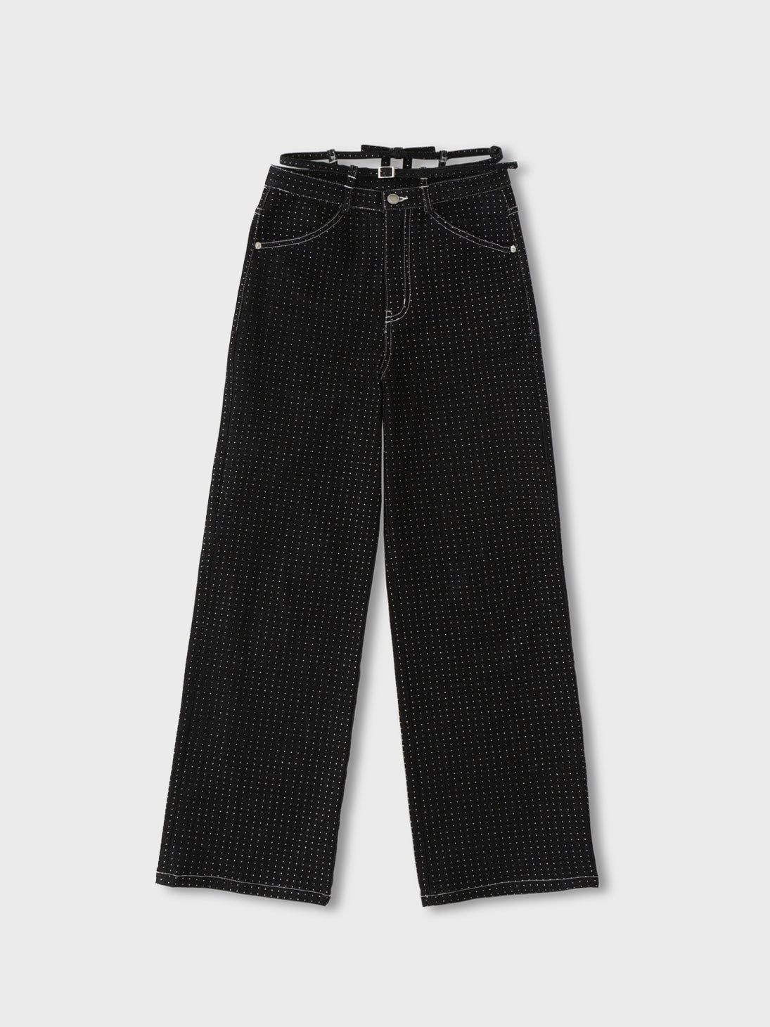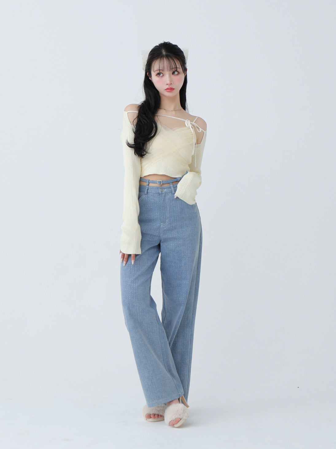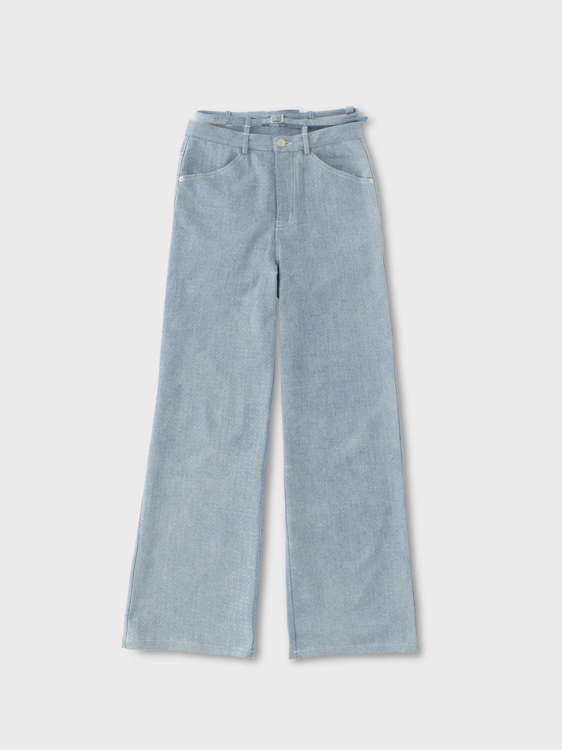 ウエストのベルトの隙間から肌がちらっとのぞく、トレンド感溢れるデニムパンツ。裾に向かって緩やかに広がるシルエットです。ハイウエスト、また膝の絞りの位置を高めに設定することで足長効果も抜群。履くだけでスタイルアップが叶う優秀アイテムです♡ 生地は、伸縮性のあるストレッチデニムを使用しており、とても良い履き心地です。キラキラのラメ加工を全体に施してあるので、どこからみても華やかな印象に。さらに白のステッチを効かせることで、レッグラインを長く美しく、さらにお尻をきゅっと小さく見せてくれます。 後ろは成形リボンでエムエメらしさをプラス。クロップド丈トップスとバランスの取りやすいデザインとなっています。