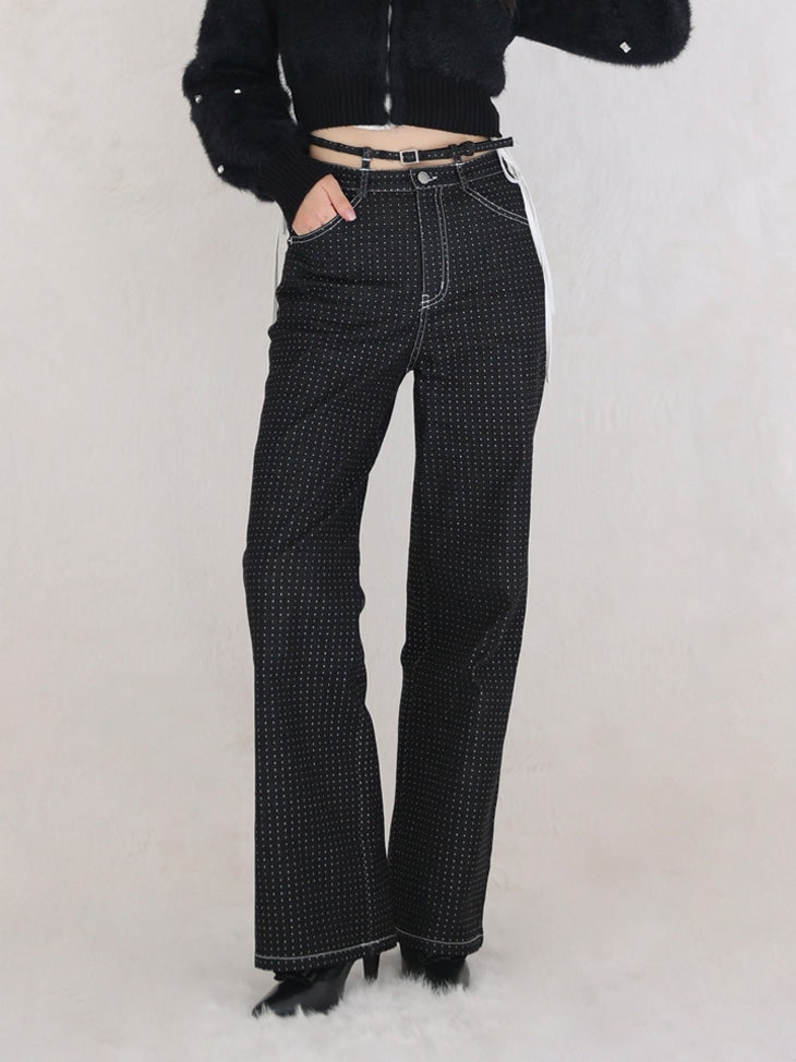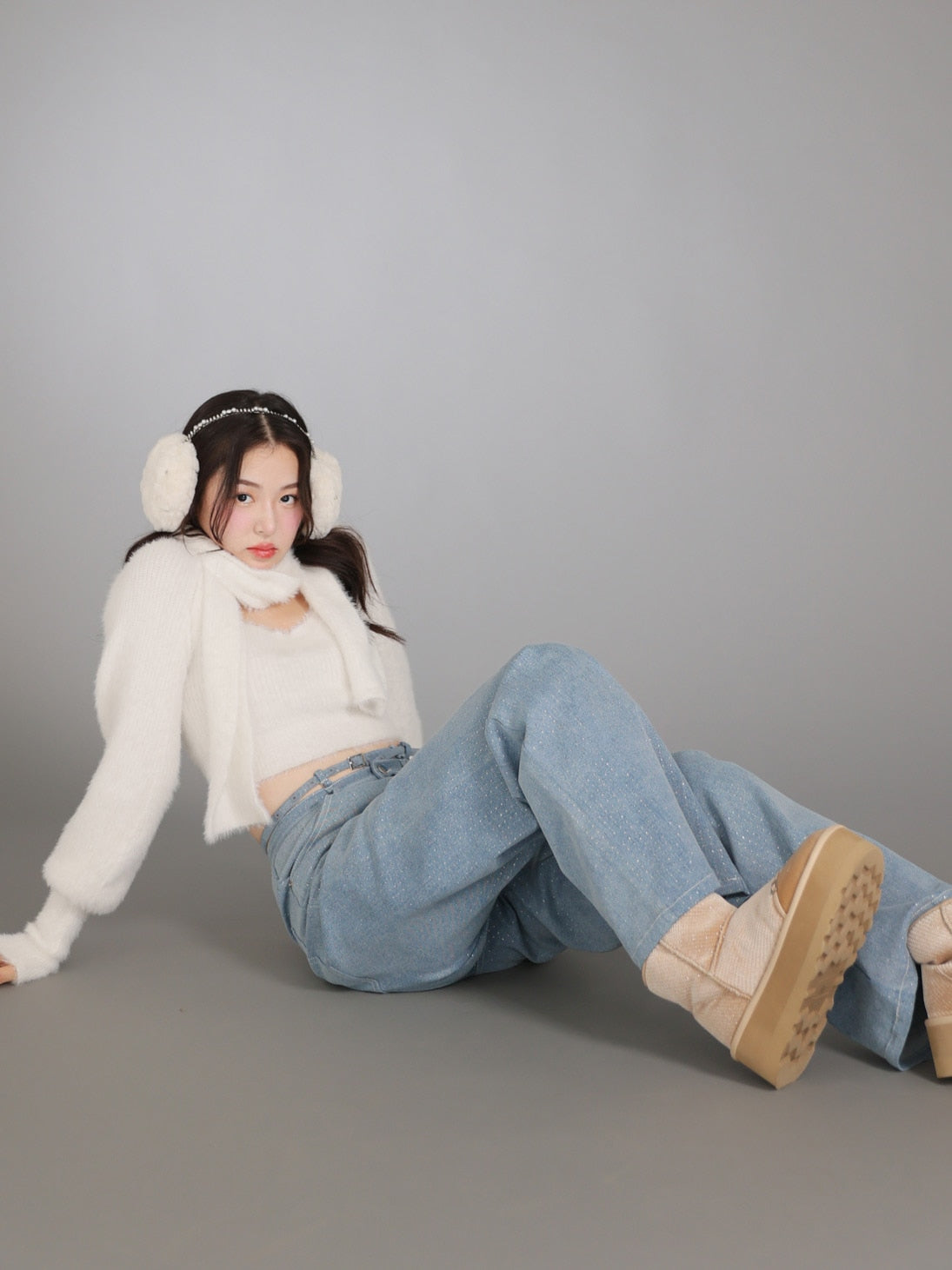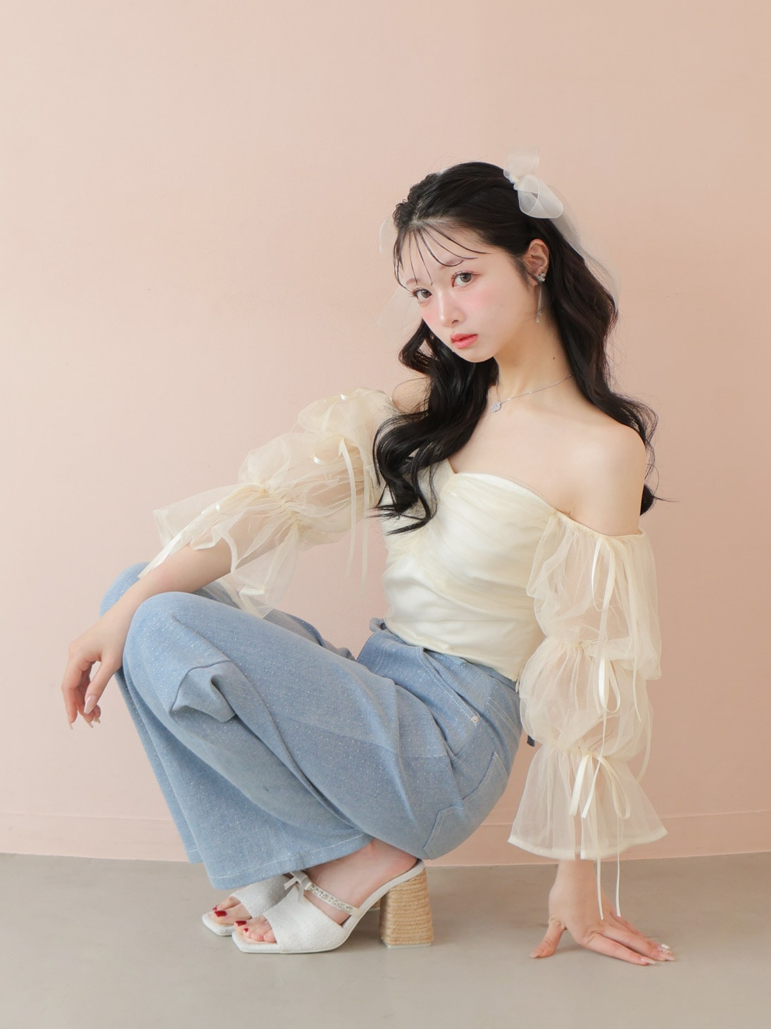 ウエストのベルトの隙間から肌がちらっとのぞく、トレンド感溢れるデニムパンツ。裾に向かって緩やかに広がるシルエットです。ハイウエスト、また膝の絞りの位置を高めに設定することで足長効果も抜群。履くだけでスタイルアップが叶う優秀アイテムです♡ 生地は、伸縮性のあるストレッチデニムを使用しており、とても良い履き心地です。キラキラのラメ加工を全体に施してあるので、どこからみても華やかな印象に。さらに白のステッチを効かせることで、レッグラインを長く美しく、さらにお尻をきゅっと小さく見せてくれます。 後ろは成形リボンでエムエメらしさをプラス。クロップド丈トップスとバランスの取りやすいデザインとなっています。