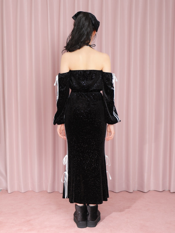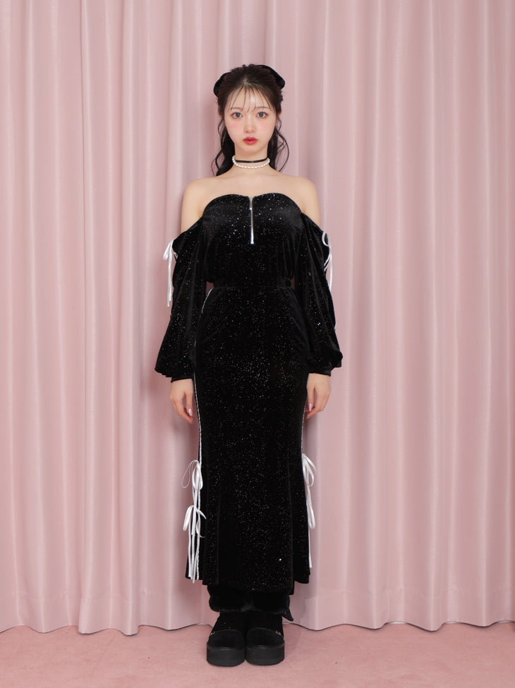 トレンドのスポーティーテイストを取り入れ、サイドにラインを施したベロアのワンピース。身頃はハイウエストにかけて切り替えを入れ、裾はしなやかなマーメイドシルエットにしたことで、体のラインを美しく見せます。バスト部分にはシリコンテープを施してあるので、ずり落ちくる心配がなく安心してご着用いただけます。デコルテが綺麗に見えるオフショルデザインにしたことで、女性らしい印象にみせてくれます。フロントのファスナーは半分程度開閉可能なので、お好みに合わせてスタイリングを楽しめます。ふんわりしたお袖と所々に配したリボンが、ほんのり甘さをプラス。またポケットも付いているので機能面も◎素材はキラキラ感のあるベロアを使用しているため、おしゃれな雰囲気を残しつつリラックスしたい日にもぴったり。サイドラインとリボンは同色のサテンで切り替え、さりげなくコントラストがつく素材で高級感を添えました。一枚で華やかさとトレンド感を叶えます。