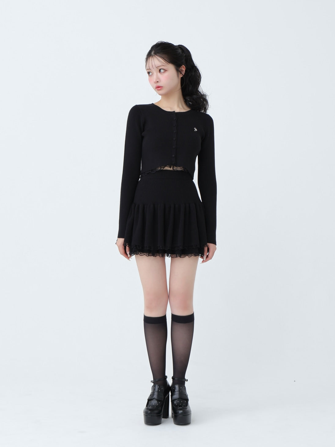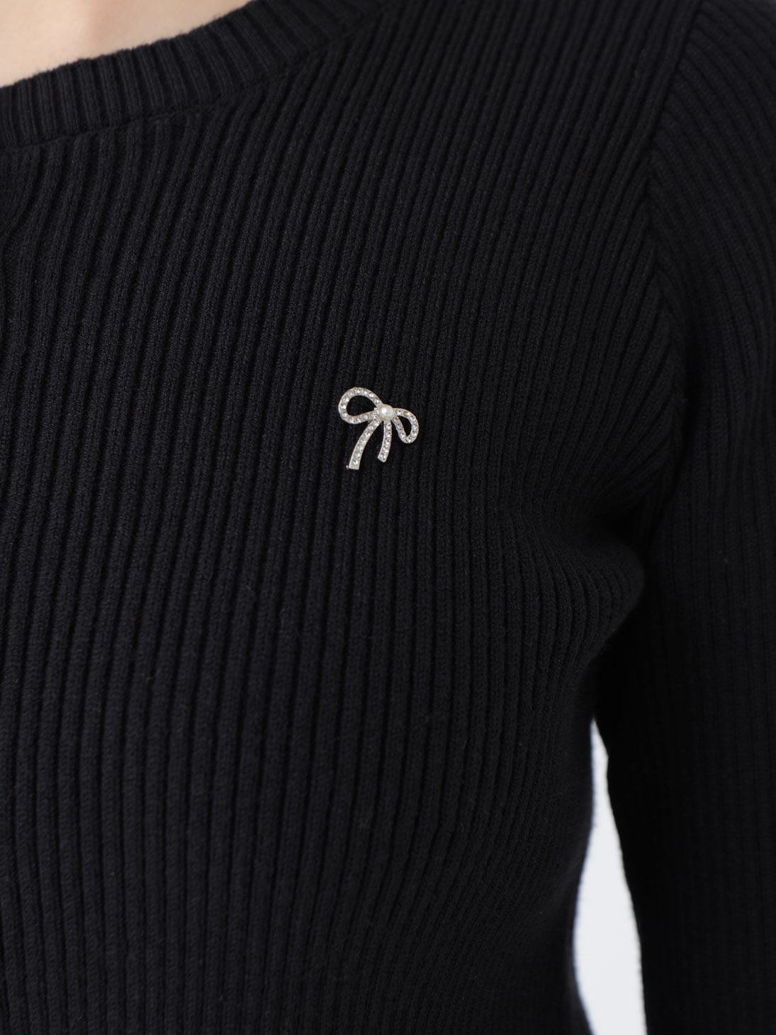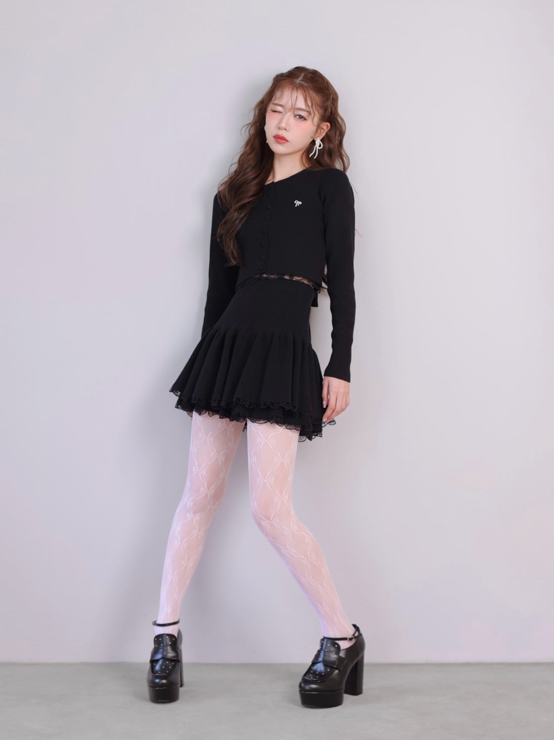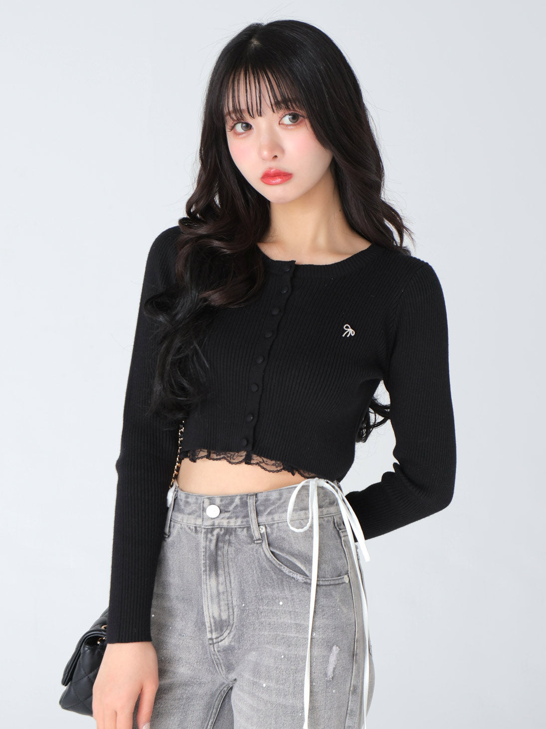 フロントはボタンとリボンチャームでシンプルなデザイン。後ろはレースを施したシースルーで、今っぽさと女性らしさを追求。大きなリボンを3つにすることで、肌見せを抑え、着やすく仕上げました。