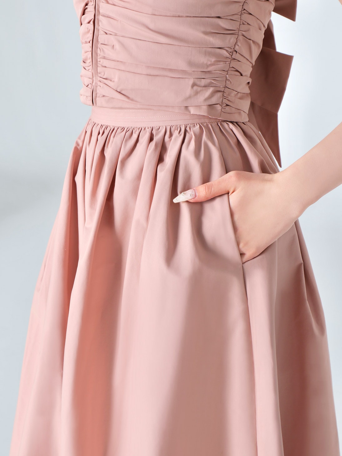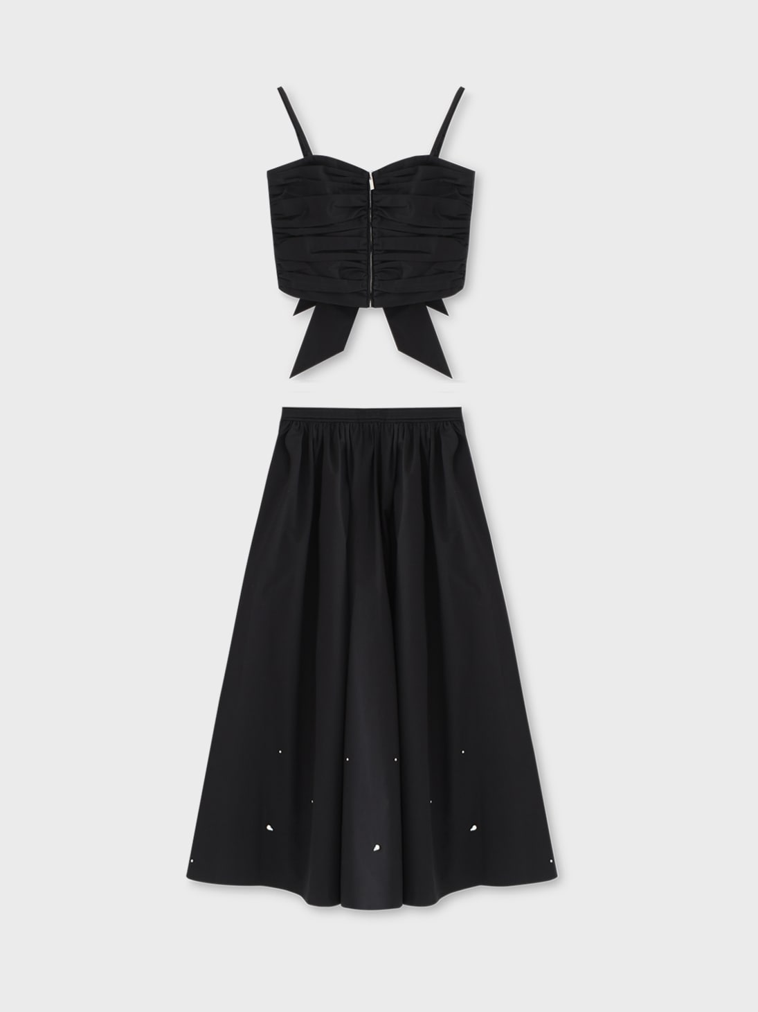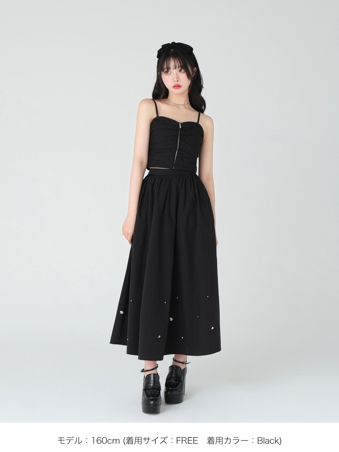 ハリ感のある素材を使用したフレアスカートが登場。ギャザーを入れてふんわりボリュームを出したトレンド感のあるフレアデザインです。裾にはビジューを施し、動くたびに華やかさを纏います。ウエスト位置は高めで脚長効果抜群。サイドにはポケットが付いていて便利です。カラーは、ロマンティックで愛らしいピンクと、大人っぽく使えて着回し力の高いブラックの2色展開です。オールシーズン活躍します。同素材を使用したビスチェ風トップスと合わせて、セットアップで着るのがおすすめです。