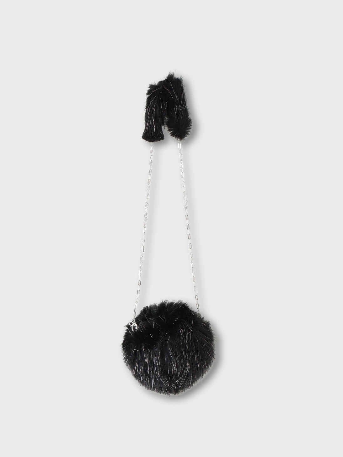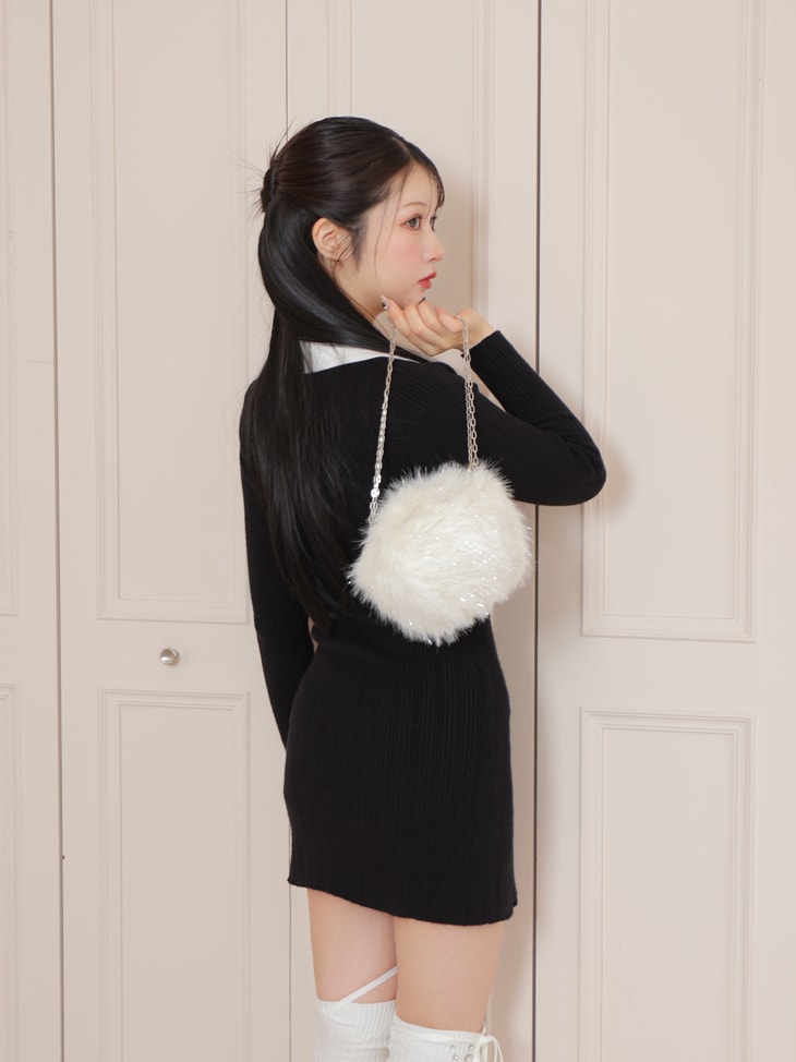 あたたかみのあるファー素材でお作りしたミニマムサイズのショルダーバッグ。コロンとした愛らしいフォルムがファーの華やかさをさらに引き立てます。シルバーのチェーンストラップは取り外し可能で2重に折り返して使用でき、斜めがけ、肩掛けとスタイリングに合わせて変更できます。また、ショルダー部分のファーはスナップボタンで取り外し可能です。容量は少なめですが、ファスナー部分にフェイクレザーのスペースを作る工夫を施すことで、ファーを巻き込まずにスムーズに物の出し入れが可能に。スマホは横にすると問題なく入れてお使いいただけます。素材はシルバーのラメ糸が入ったフェイクファーで、小ぶりながらも存在感たっぷり。コーディネートに取り入れるだけでワンポイントになる、シーズンムード高まるアイテムです。