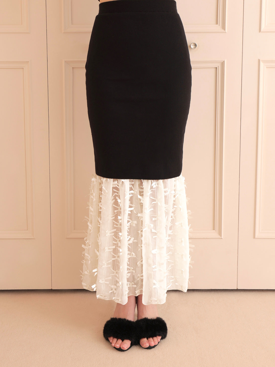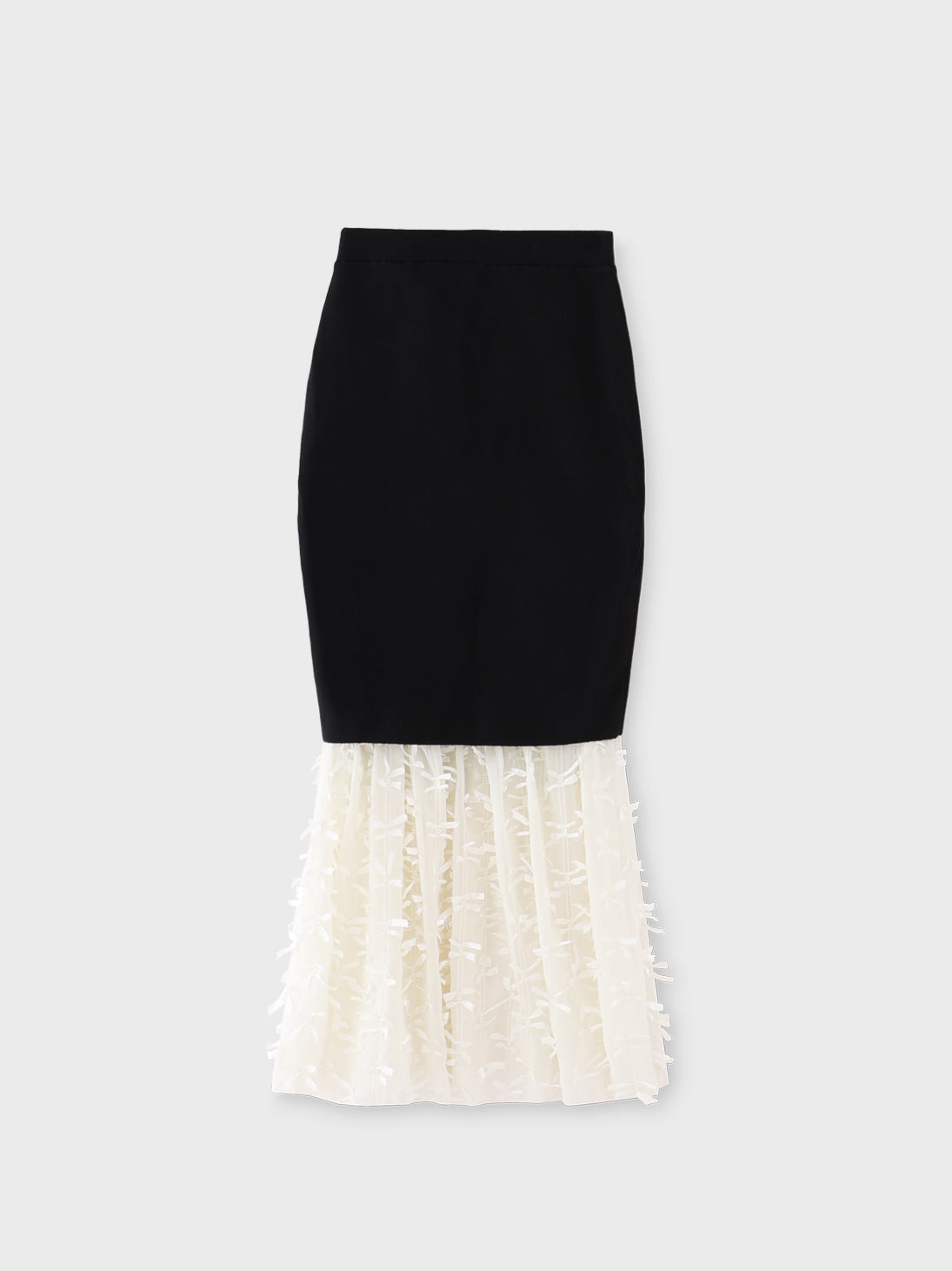 裾のチュール部分には程よい透け感があり、リボンモチーフを施した華やかな生地を使用しています