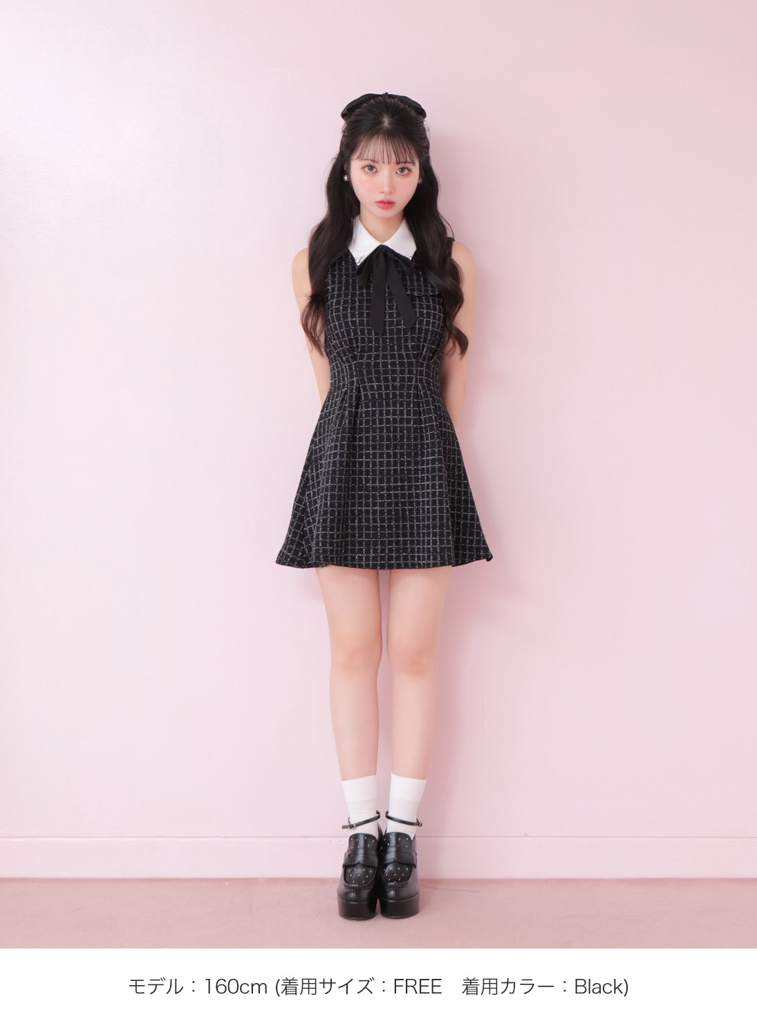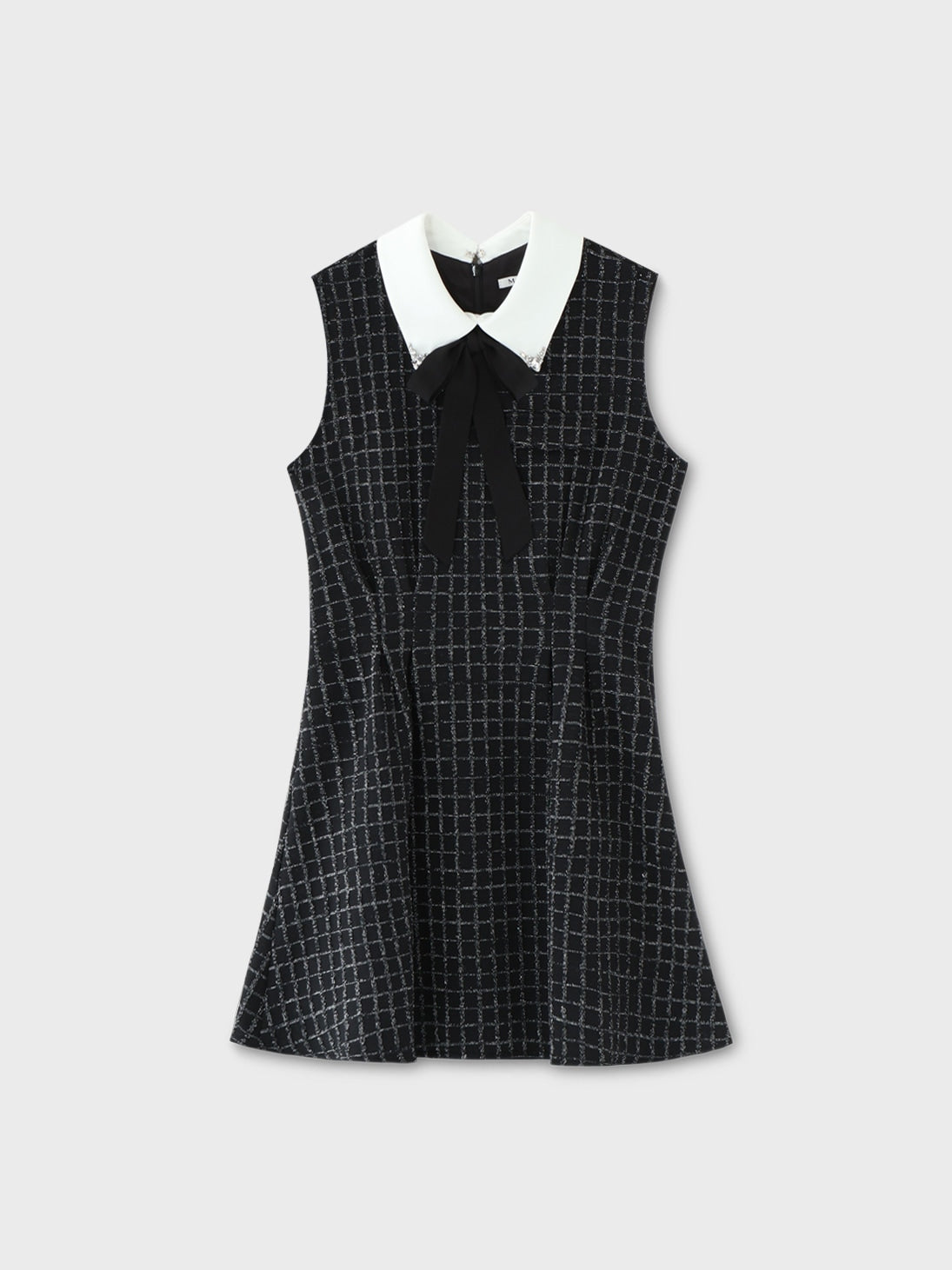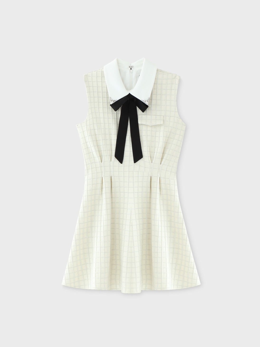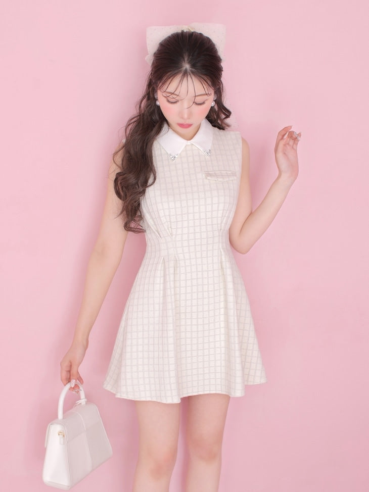 ラメ糸を織り込んだサマーニット生地でお作りした、上品な格子柄ミニワンピース。