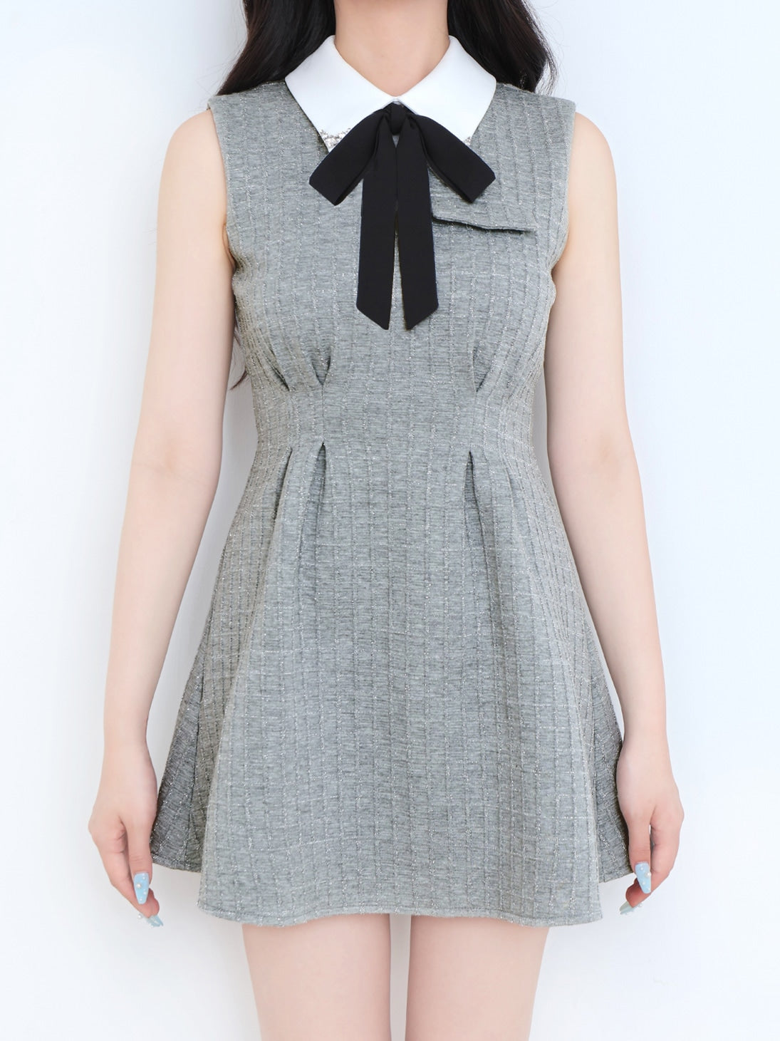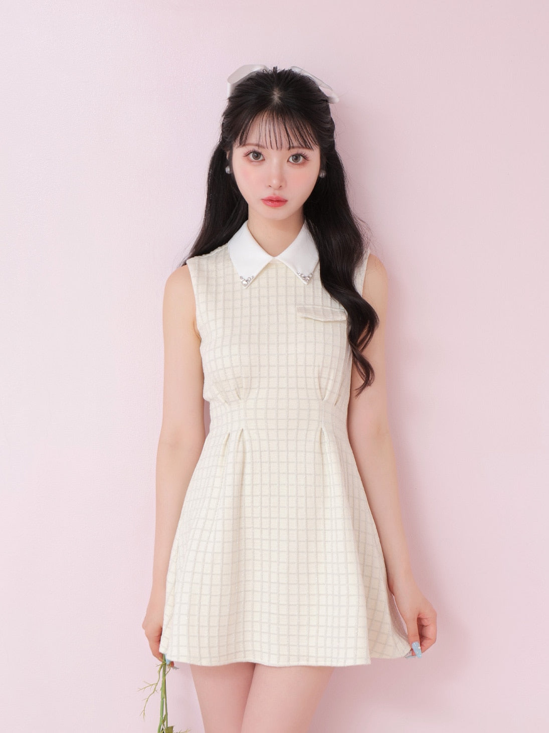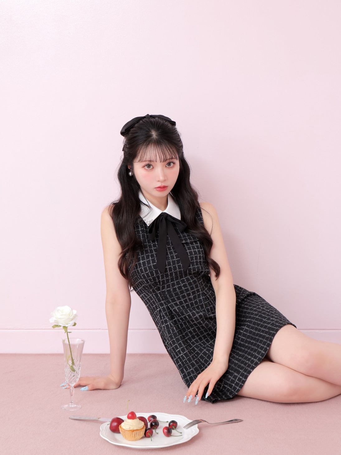 ラメ糸を織り込んだサマーニット生地でお作りした、上品な格子柄ミニワンピース。