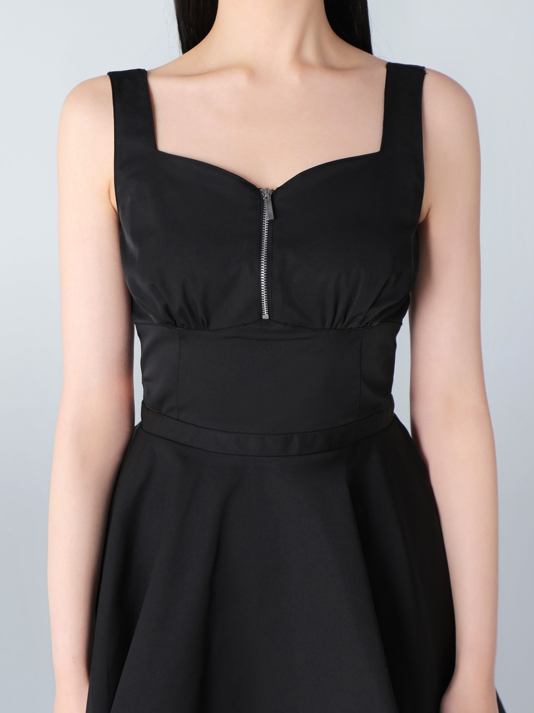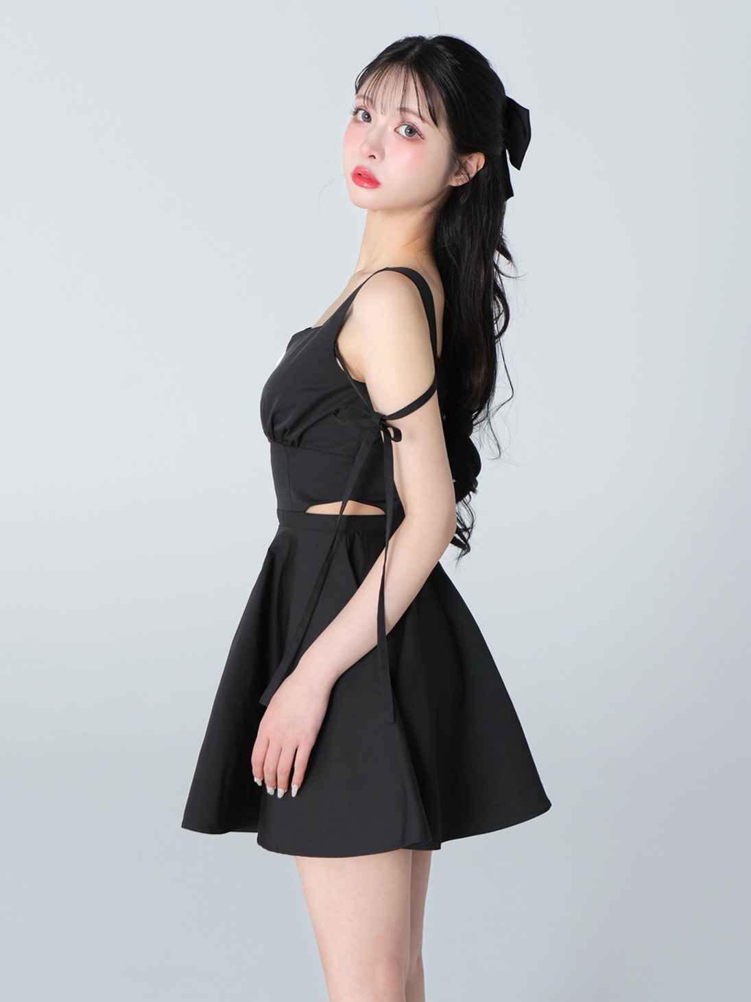 シンプルながら適度な肌見せと軽快な素材感で、モードに着ていただけるミニワンピース。ウエストシェイプは高めの位置で設定し、裾にかけてふわっと広がるシルエットがスタイルアップを叶えます。フロントジップとウエストサイドのカットアウトデザインが、抜け感を演出。サイドリボンは長めに取り、エムエメらしい甘さのあるアクセントに。リボンは取り外しができるので、その日の気分に合わせてシンプルに着ていただくこともできます。程よいハリ感でシャカシャカした素材は身体のラインを拾いすぎず、ストレスフリーな着心地です。ローファなどシックなシューズにもカジュアルなシューズとの相性が良く、スポサンと合わせるのもおすすめです。