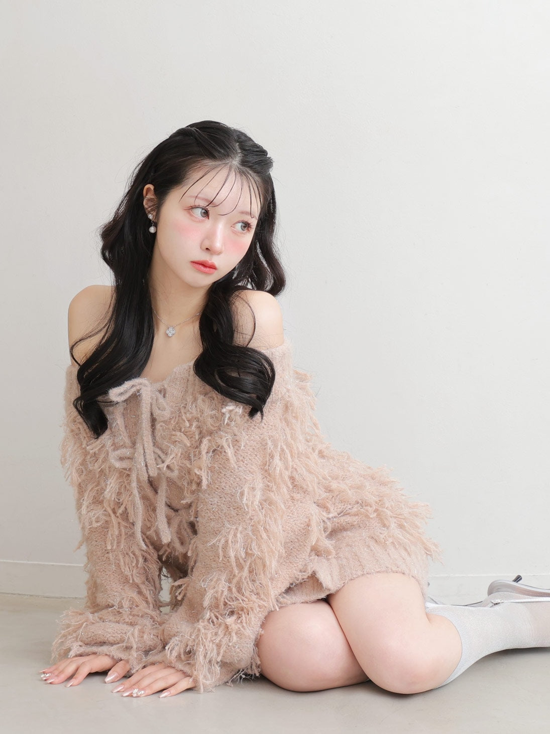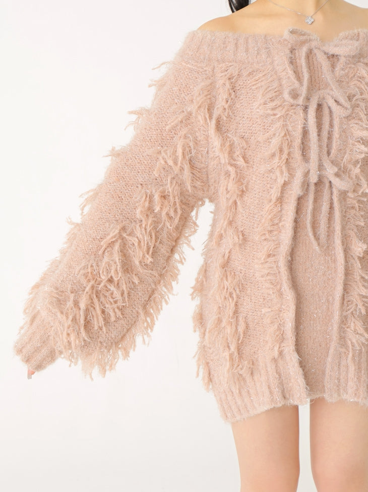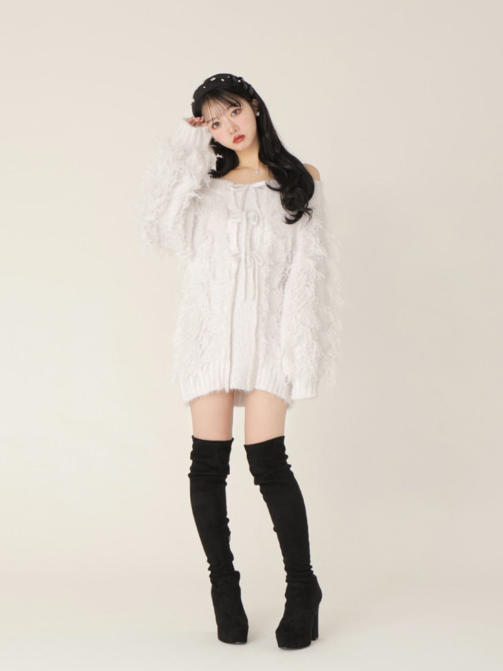 ワンピースとカーディガンをレイヤードしたように見える、新鮮なデザインのニットワンピース。ラメ糸が編み込まれ、フサッとしたフリンジの長めの毛足が、華やかな存在感を放ちます。襟ぐりにはゴムを入れ、袖口と身頃裾はリブ編みにすることでふんわりとしたシルエットにこだわりました。襟ぐりにはしっかりとしたゴムを使用しているため、安心して着て頂けます。フロントはリボンを三つ並べ、キュートなポイントに。成形リボンなので崩れる心配はありません。大人っぽく着て頂けるブラック、顔まわりがパッと明るくなるホワイト、大人可愛いくすみピンクの3色をご用意しました。