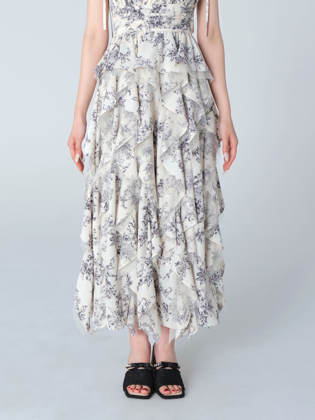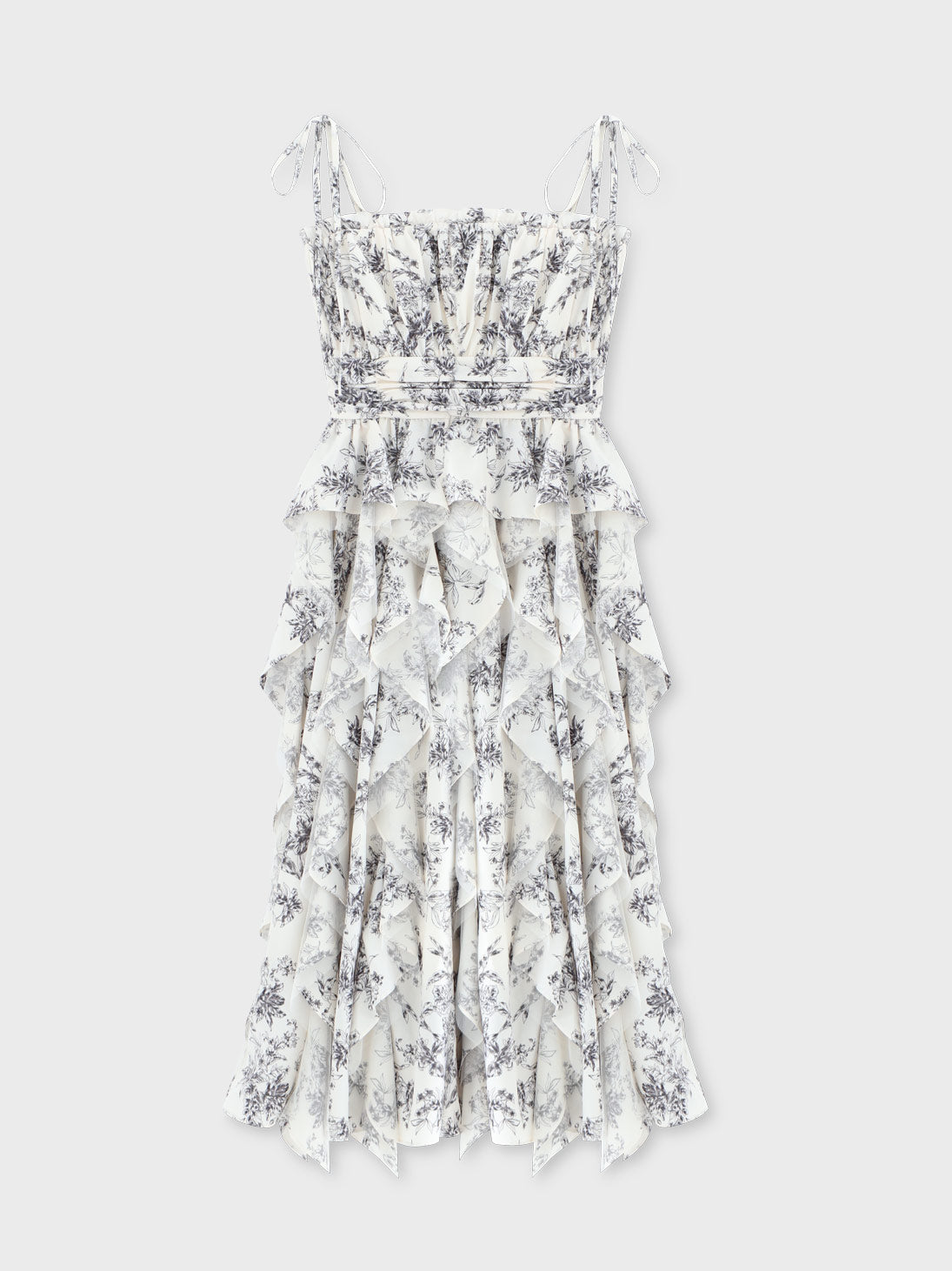 【スパイラルフリルが存在感を発揮するフラワープリントワンピース】