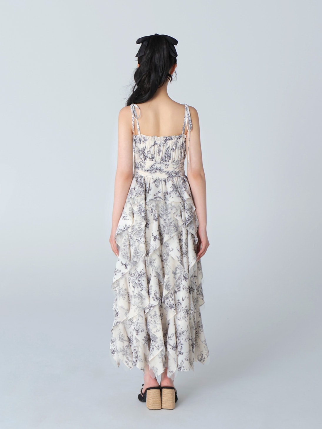 アイボリー×ダークグレーのフラワープリントで仕上げた、夏にぴったりのワンピース。サラッと一枚着るだけで印象的に魅せてくれます。胸元はギャザーでふんわりと仕上げ、デコルテラインがキレイに映えるアイテムです。背中の上身頃にもギャザーが入っているので、着心地の良さを叶えながら後ろから見たときもキレイにフィットします。ウエスト位置を高めに切り替え、メリハリが出てスタイルアップ効果抜群です。スカートは螺旋状に配置したたっぷりのフリルの上にチュールを施し、大人可愛いムードを演出。夏は一枚で、まだ肌寒さが残る季節はデニムのジャケットやカーディガンをさらっと肩掛けしていただくのがおすすめです。
