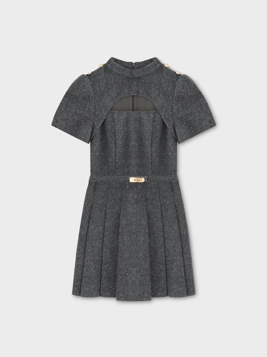 ツイードライクなヘリンボーン素材とコンパクトなシルエットが印象的なミニワンピース。