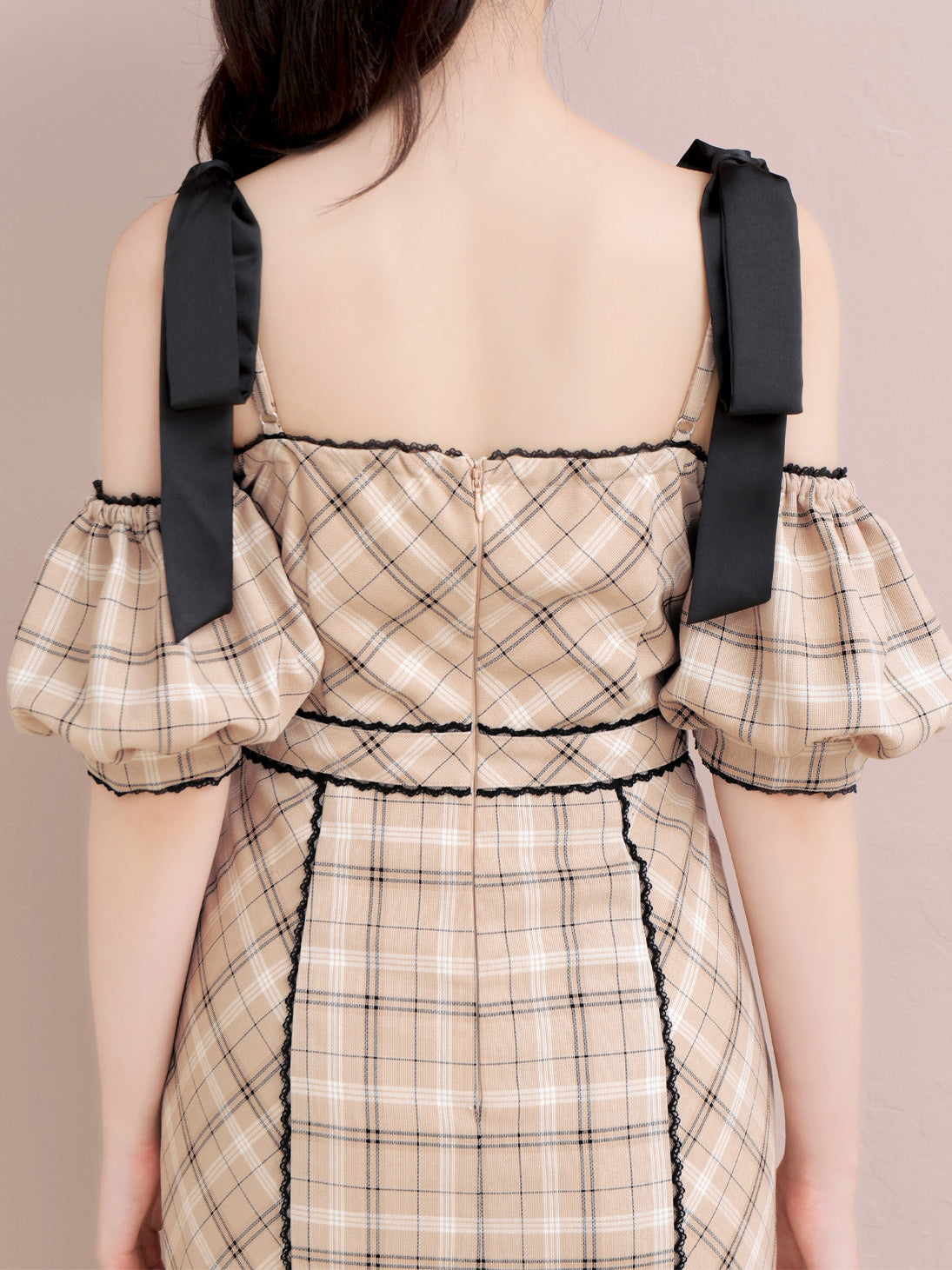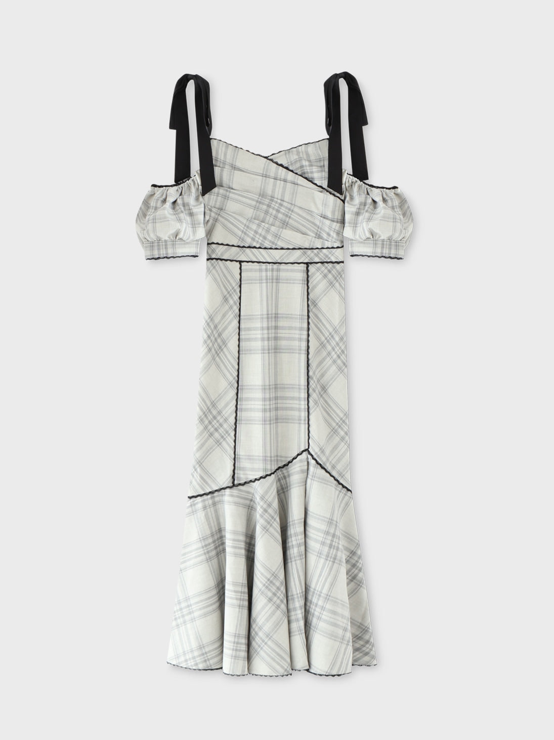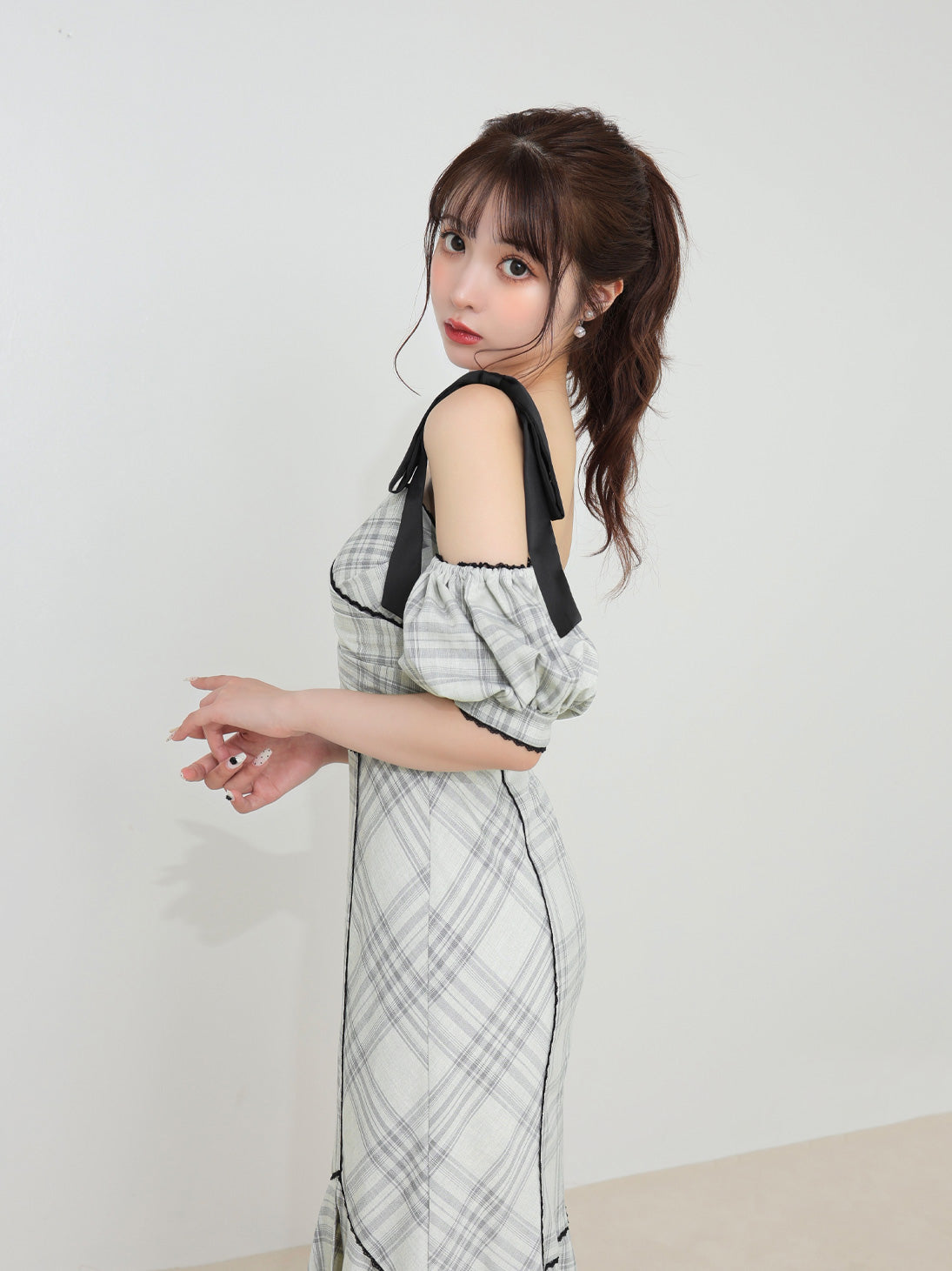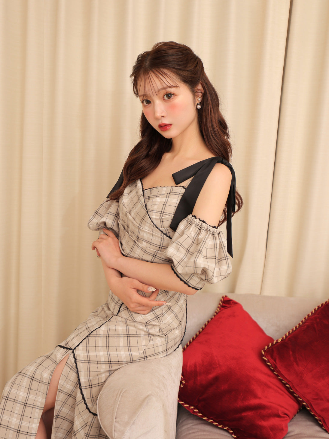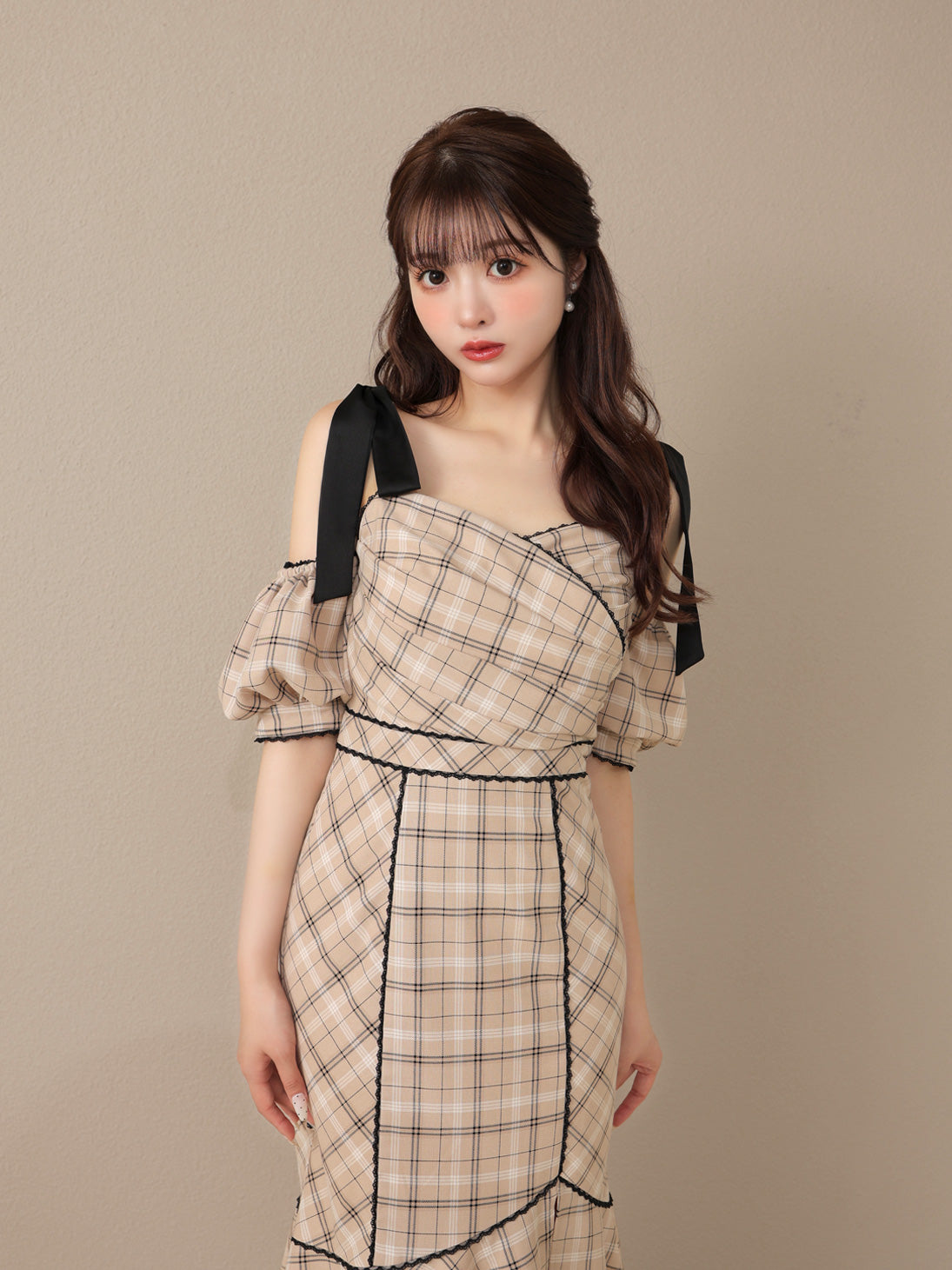 デコルテを美しく引き立てるカシュクールデザインに可憐なリボンを添えたショルダーが華やかさと女性らしさを洗練された印象へと導きます。