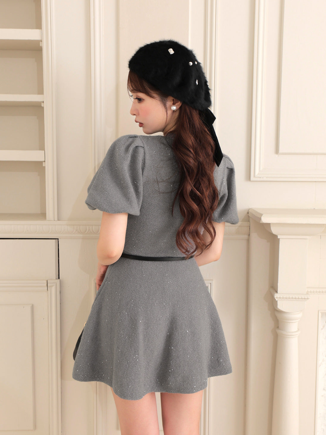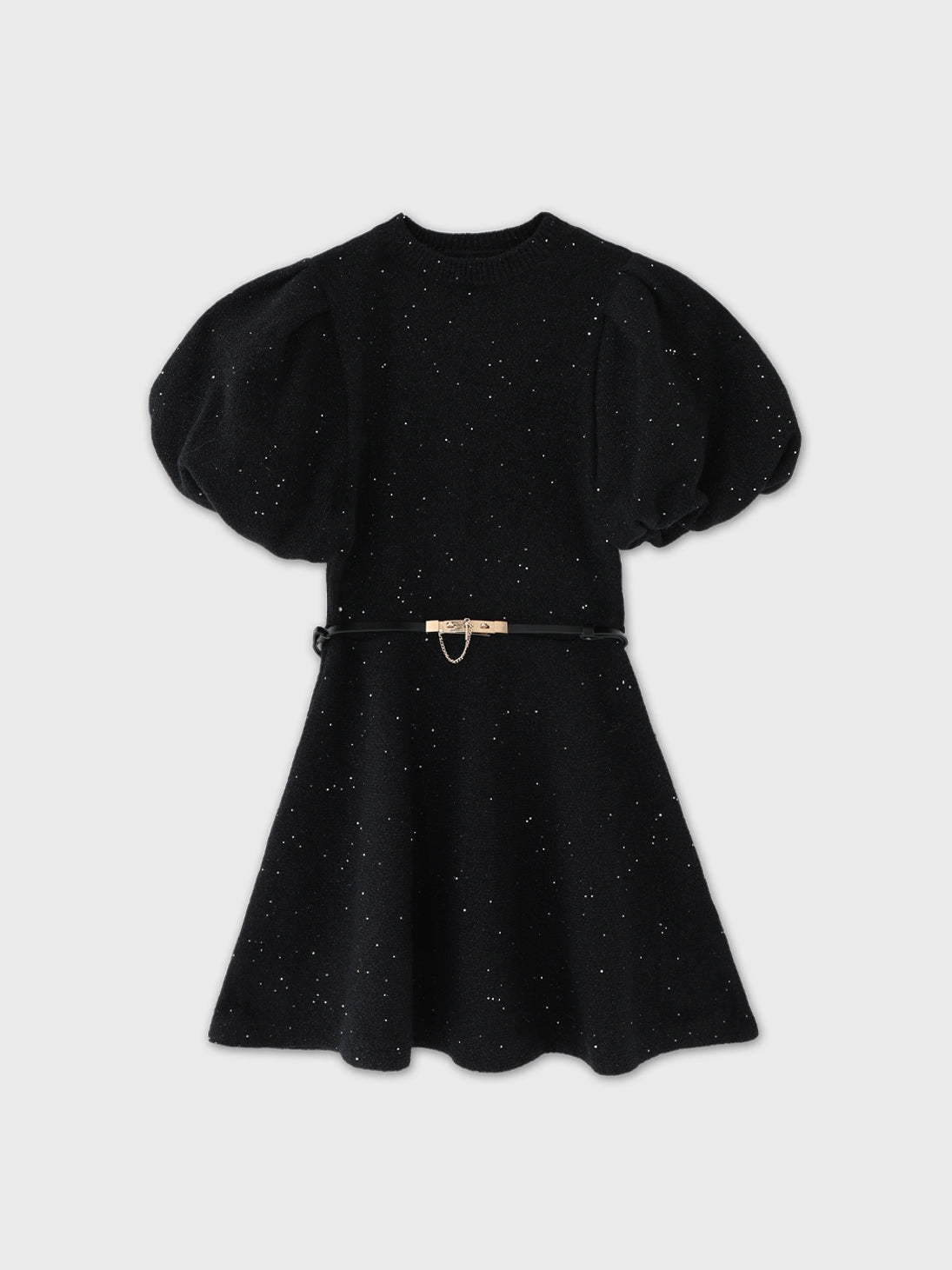 全体にあしらわれたスパンコールが光を受けて繊細に輝くニットワンピース。