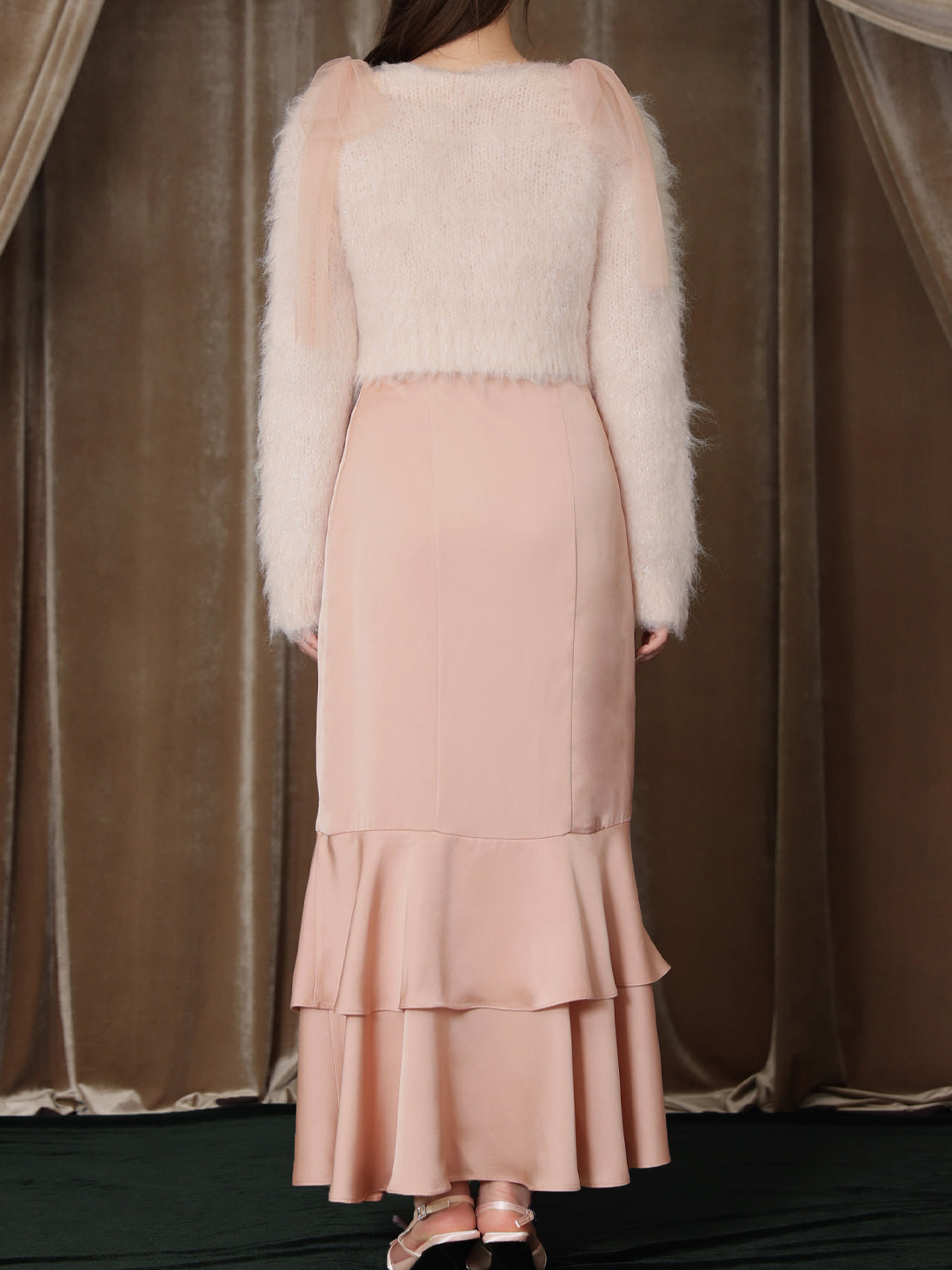 ふわっと輝くラメシャギーニットと、とろみのあるサテンキャミワンピースを組み合わせたセットアイテム。