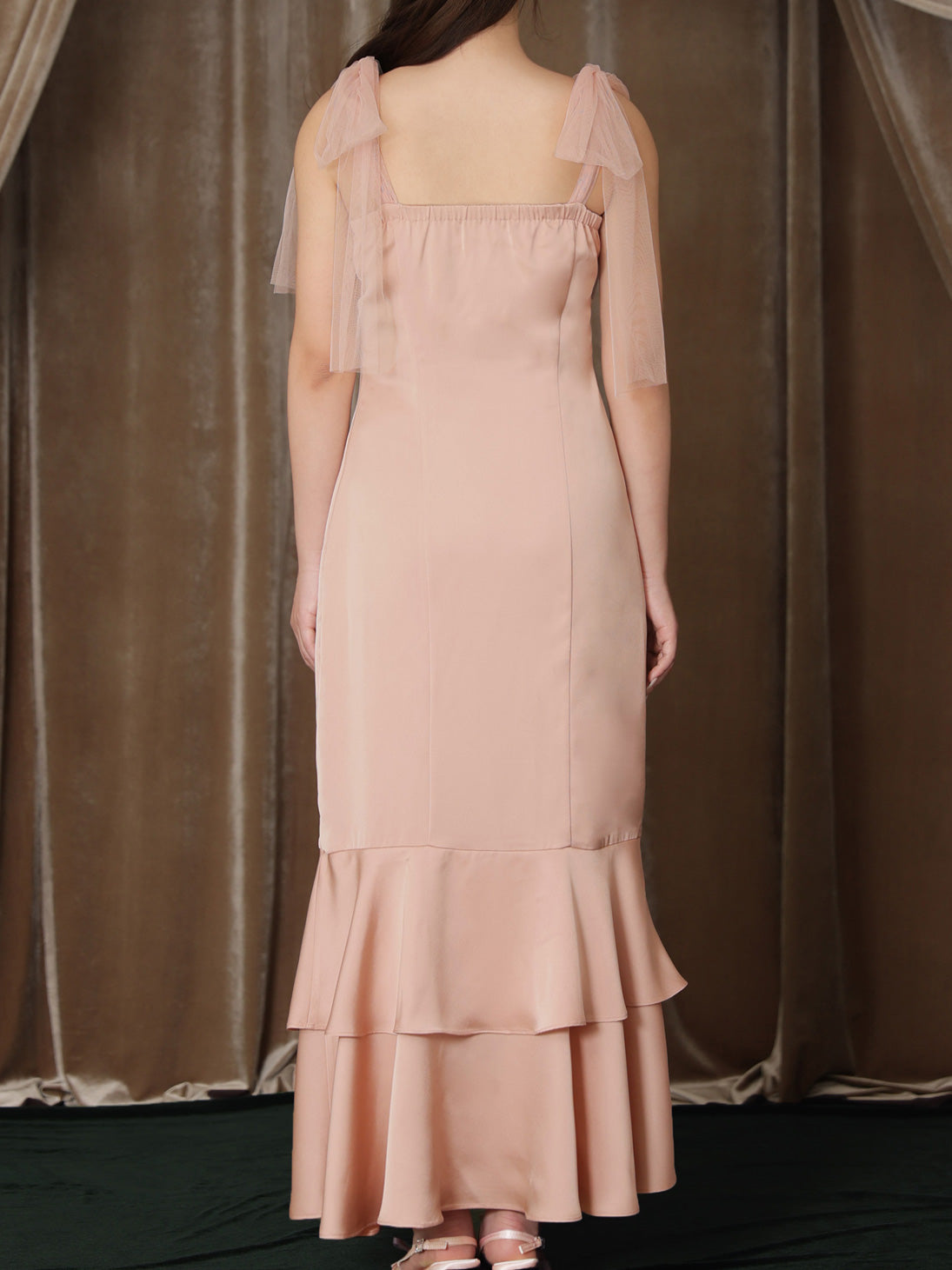 キャミワンピースはアシンメトリー裾フリルと肩のチュールリボンで華やかさを添え、歩くたびふわっと揺れるフェミニンな印象に。
