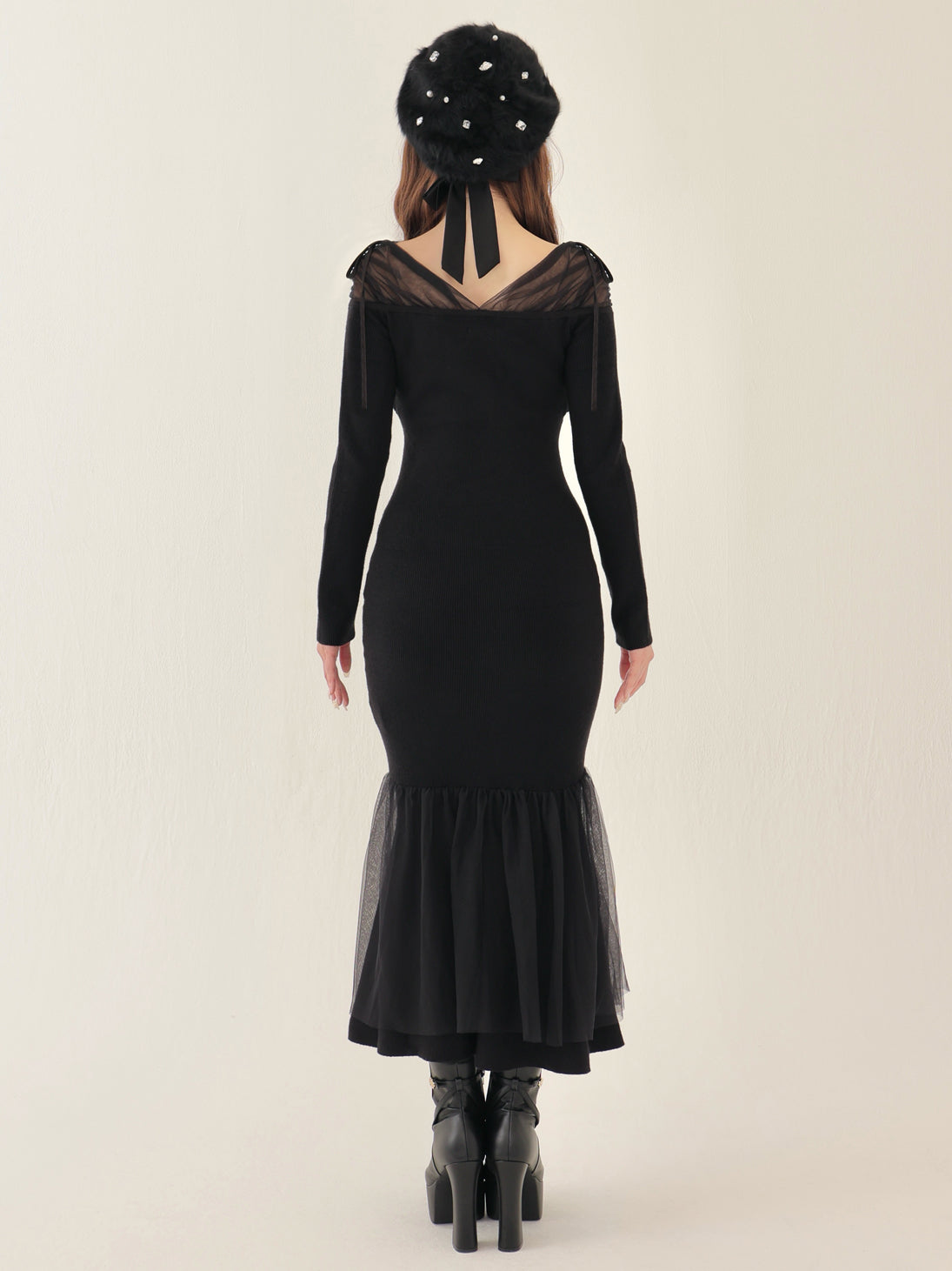 程よく肌を覗かせるディアショルダーが、大人の上品な色香を引き立てるニットマーメイドワンピース。