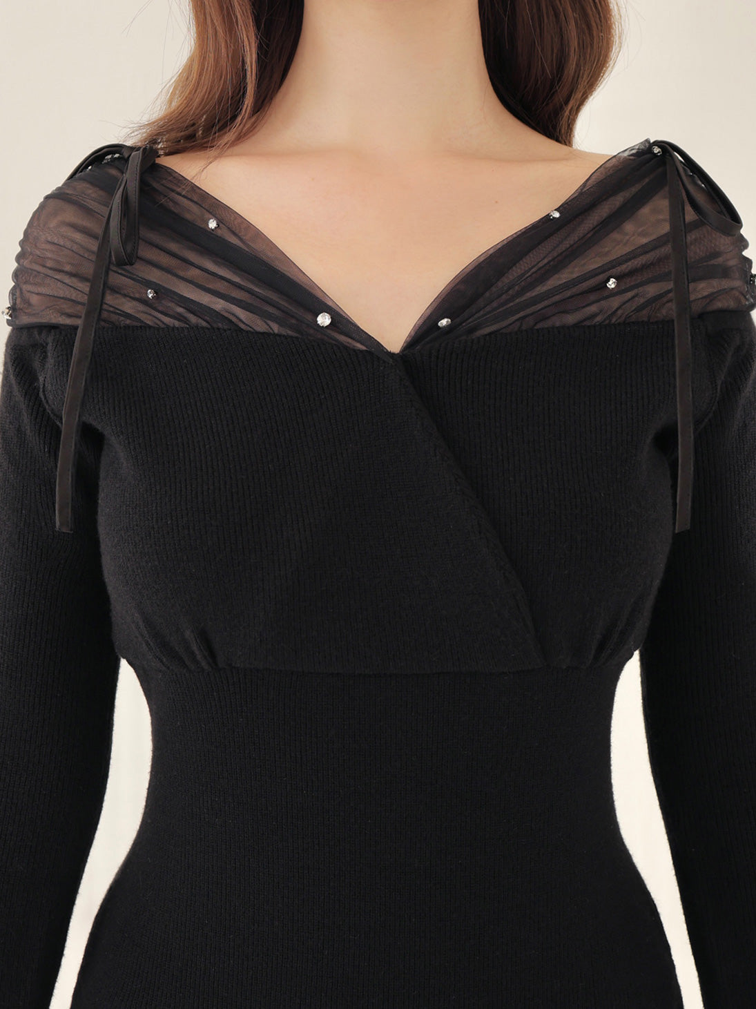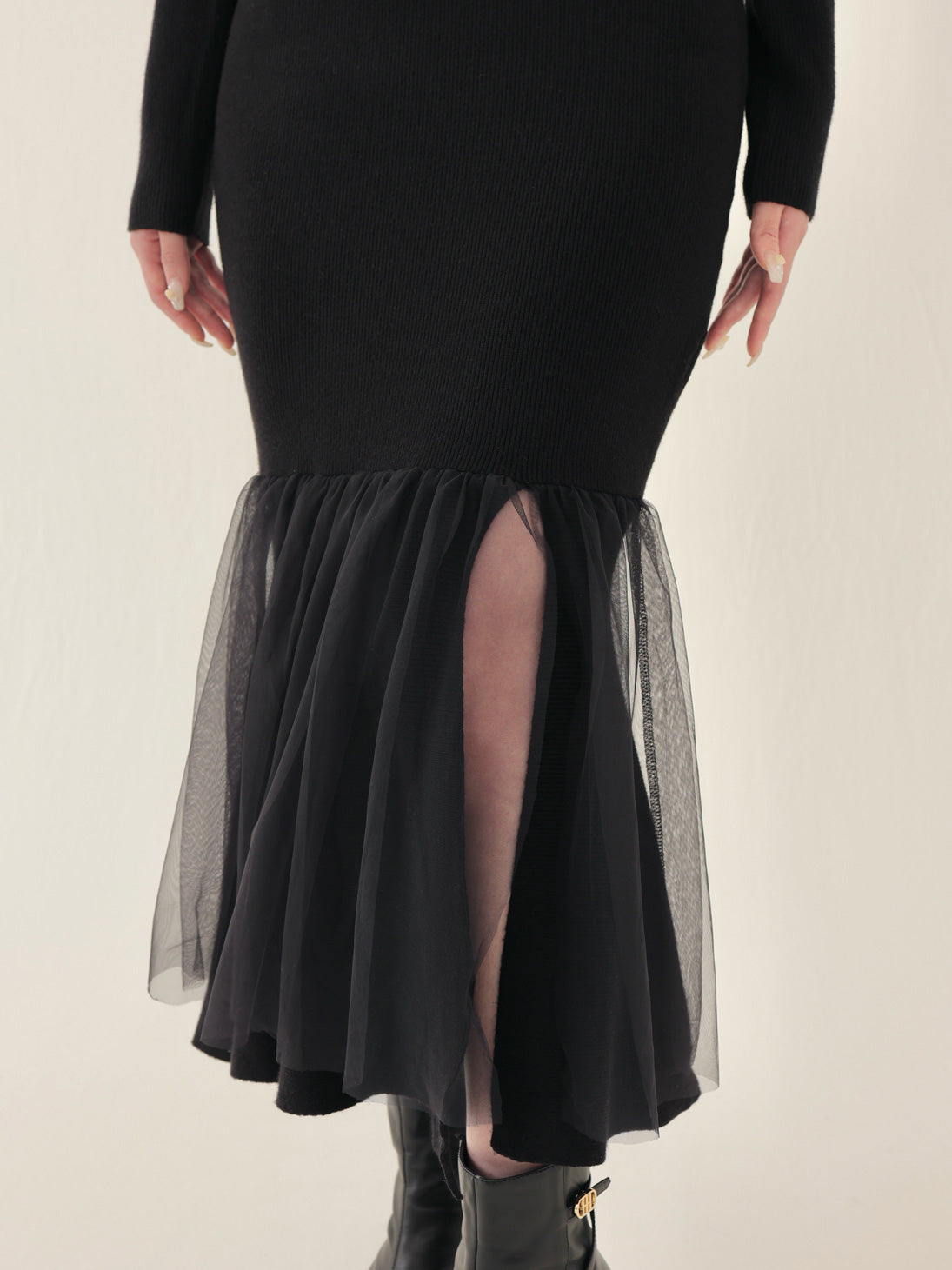 別布のチュール部分は繊細で軽やかに揺れ、ニットとの異素材コントラストが上品さを際立てます。