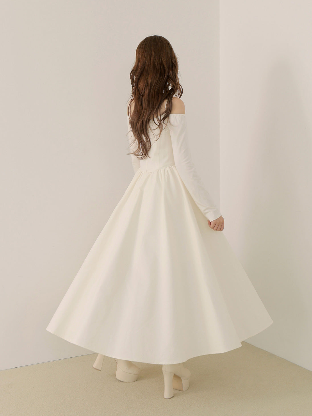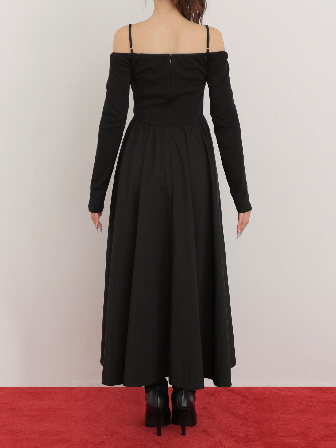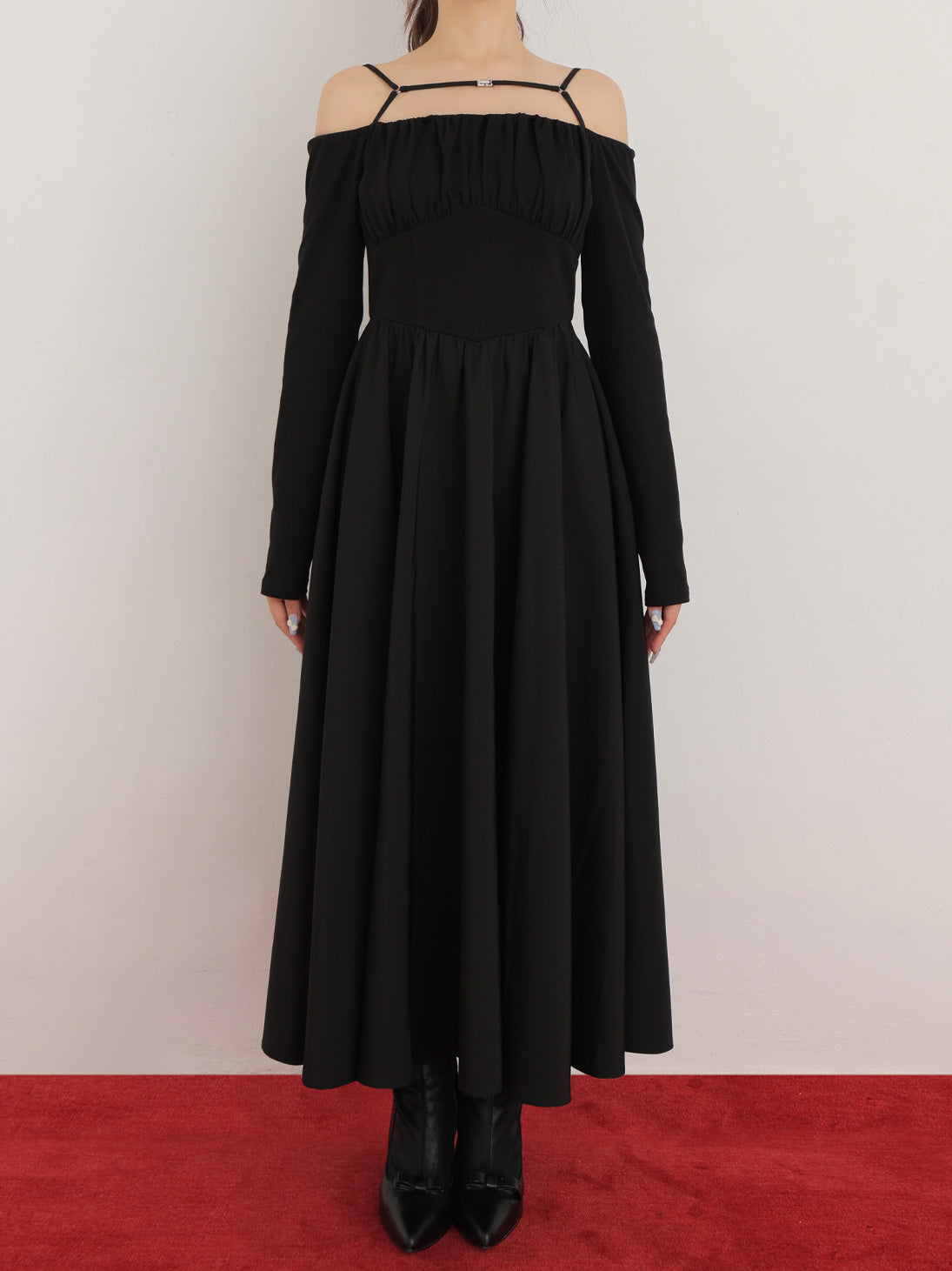 シンプルなデザインながら、バストに施したギャザーで立体感を生み、ウエスト切り替えで引き締まったラインを描きます。