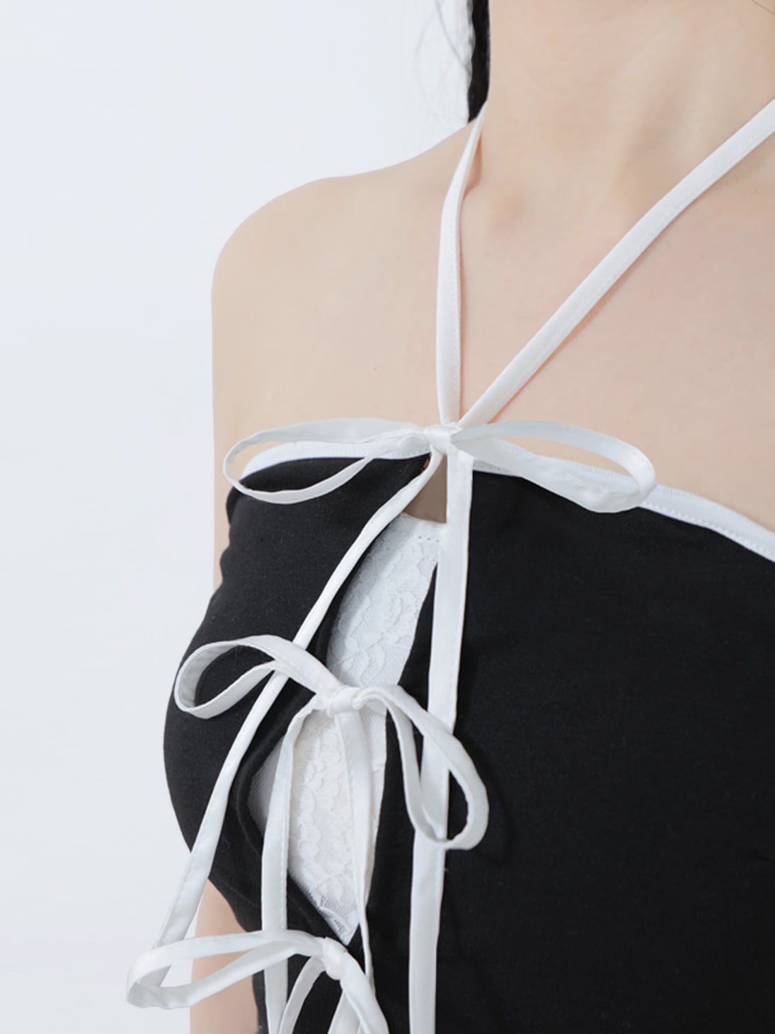 フロントはレースがのぞく甘めなお作りで、さらに3連リボンが華やかさをアップ。