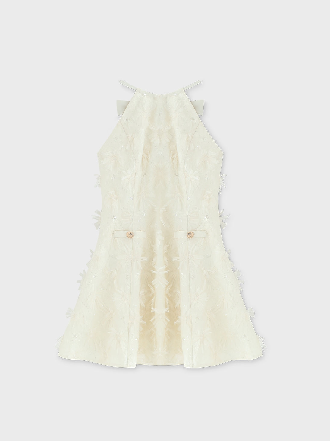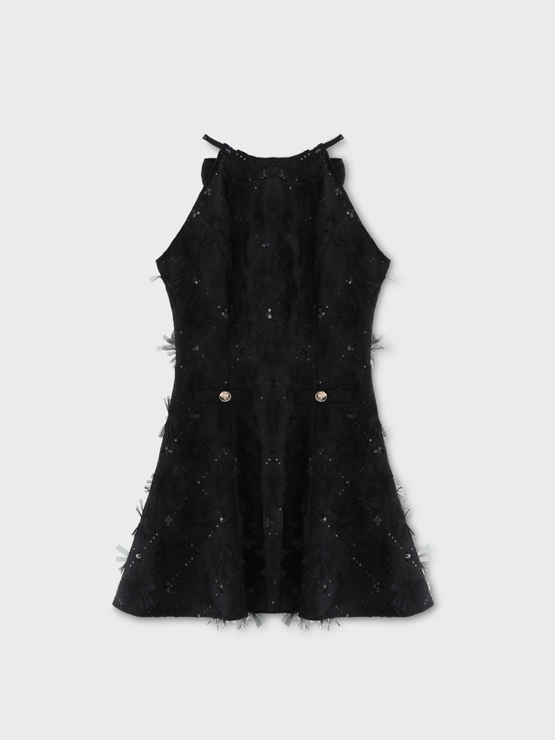 立体感のあるジャガード生地に、フラワーチュールと繊細なスパンコールを重ねた華やかな素材感。