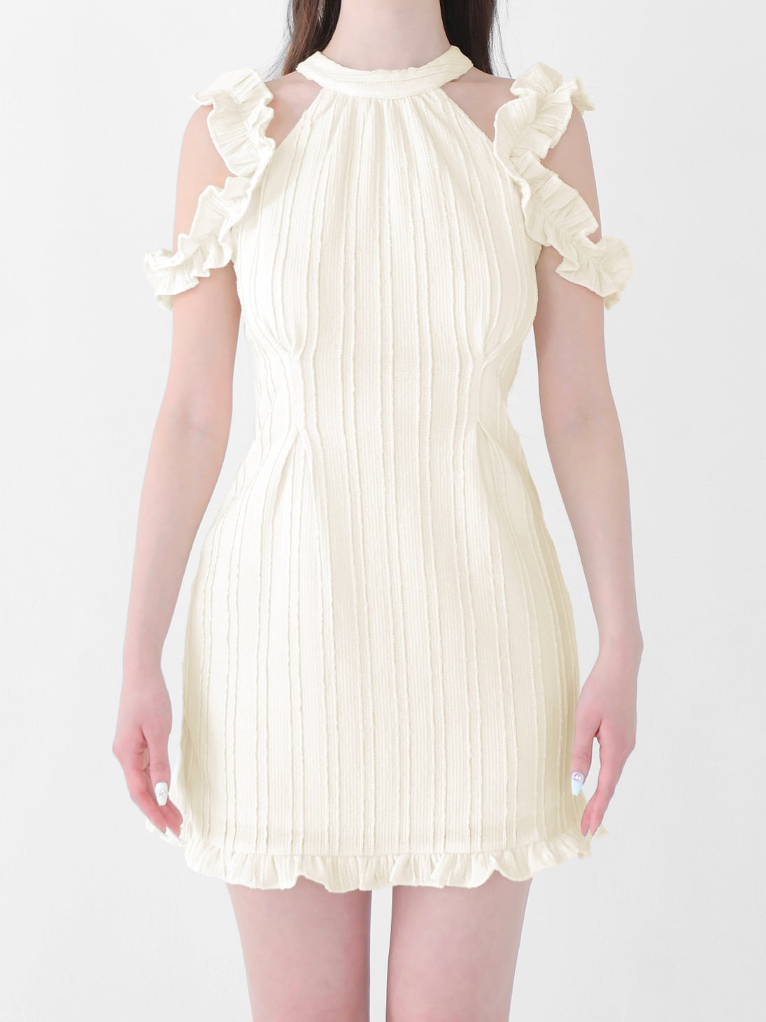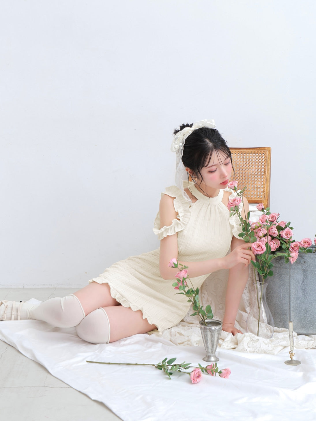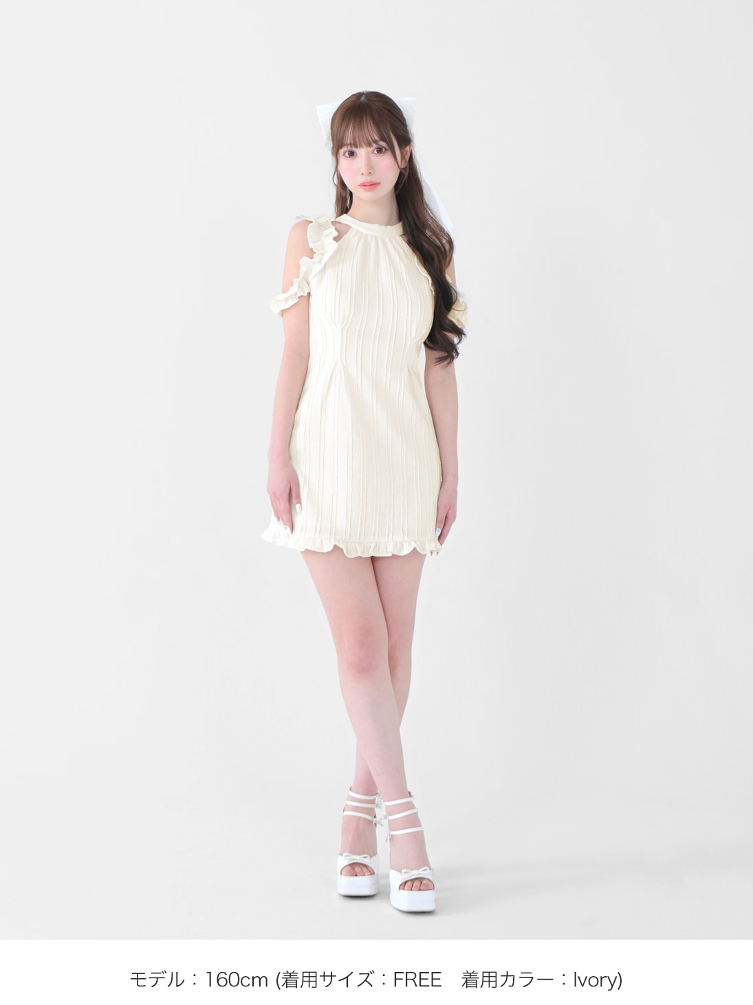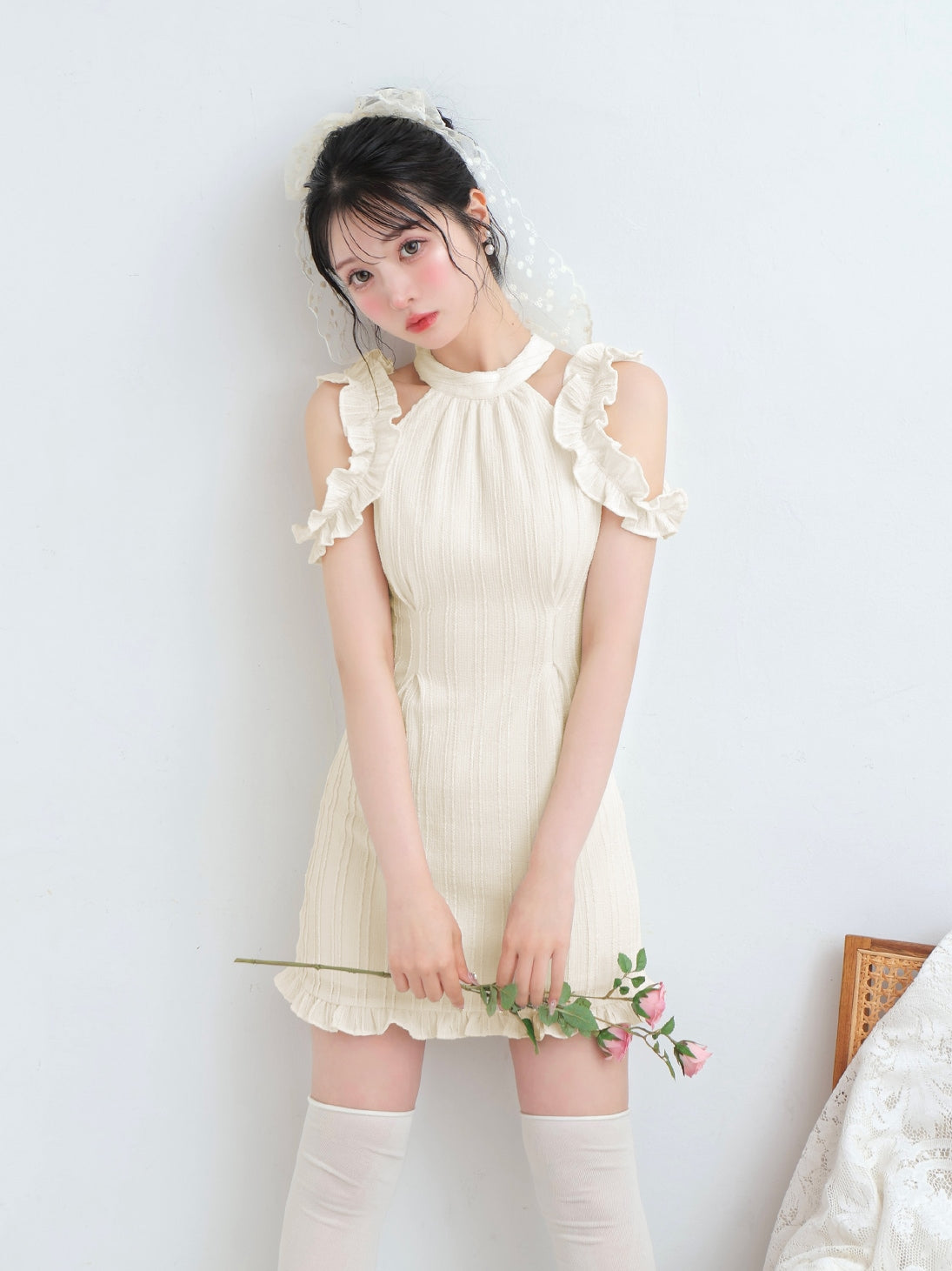ホルターネックと肩回りのフリルがお顔周りを華やかに惹き立てます。