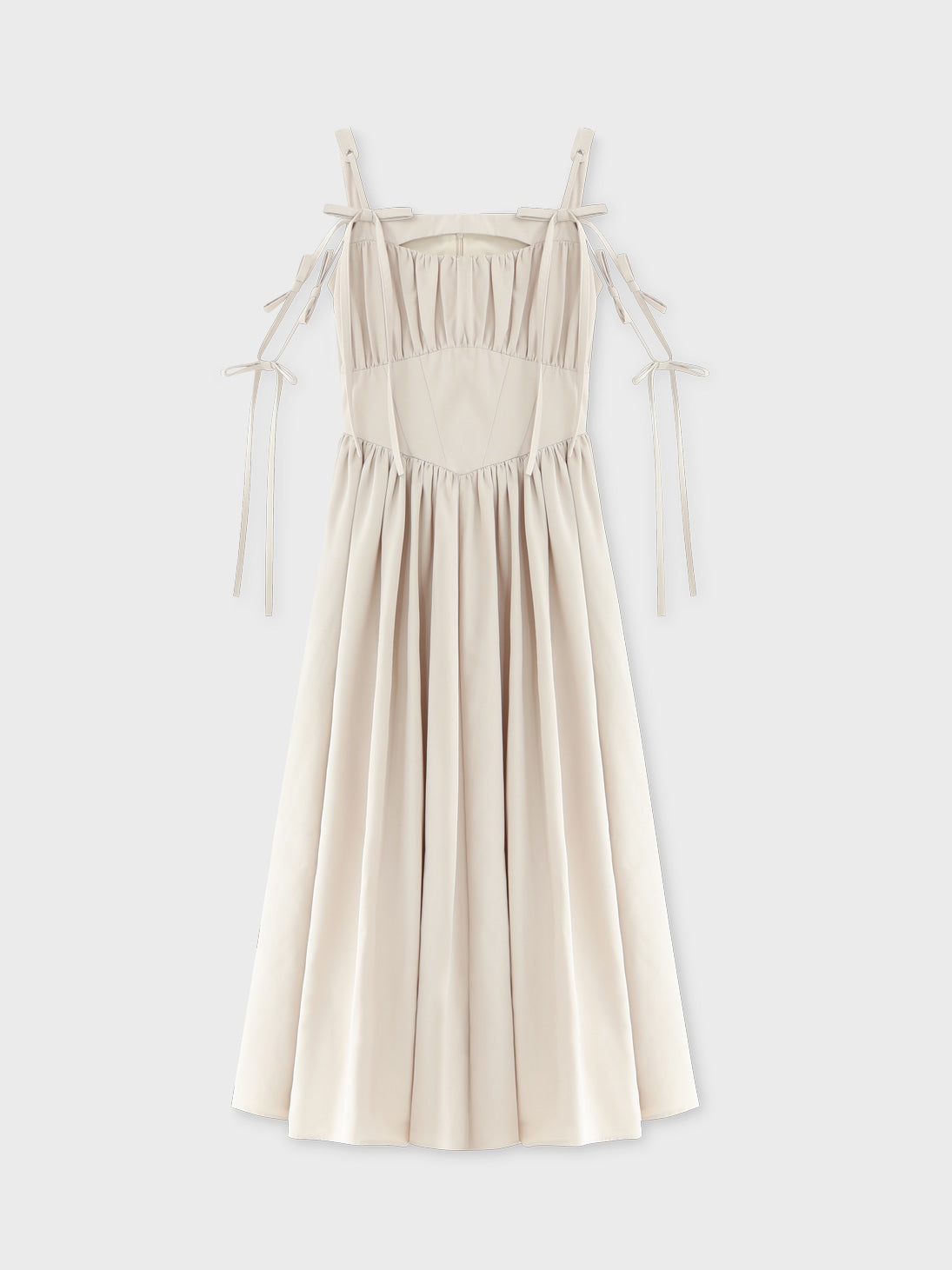 バストのギャザーで立体感を引き立てながら、胸元のカットアウトが抜け感をプラス。