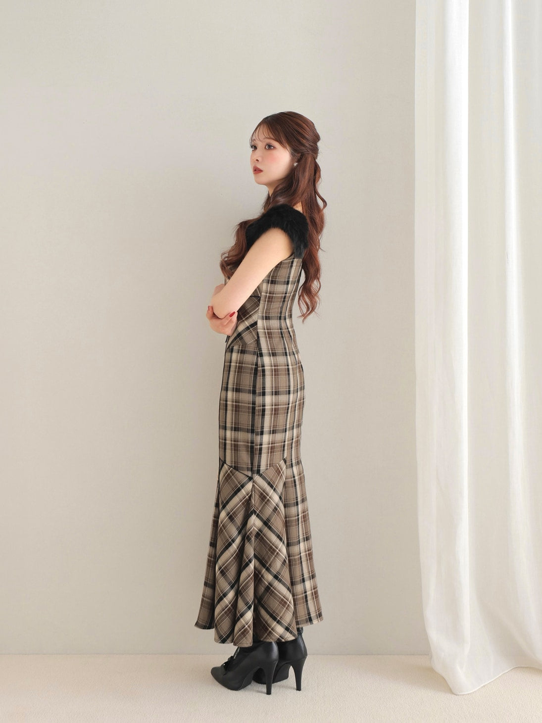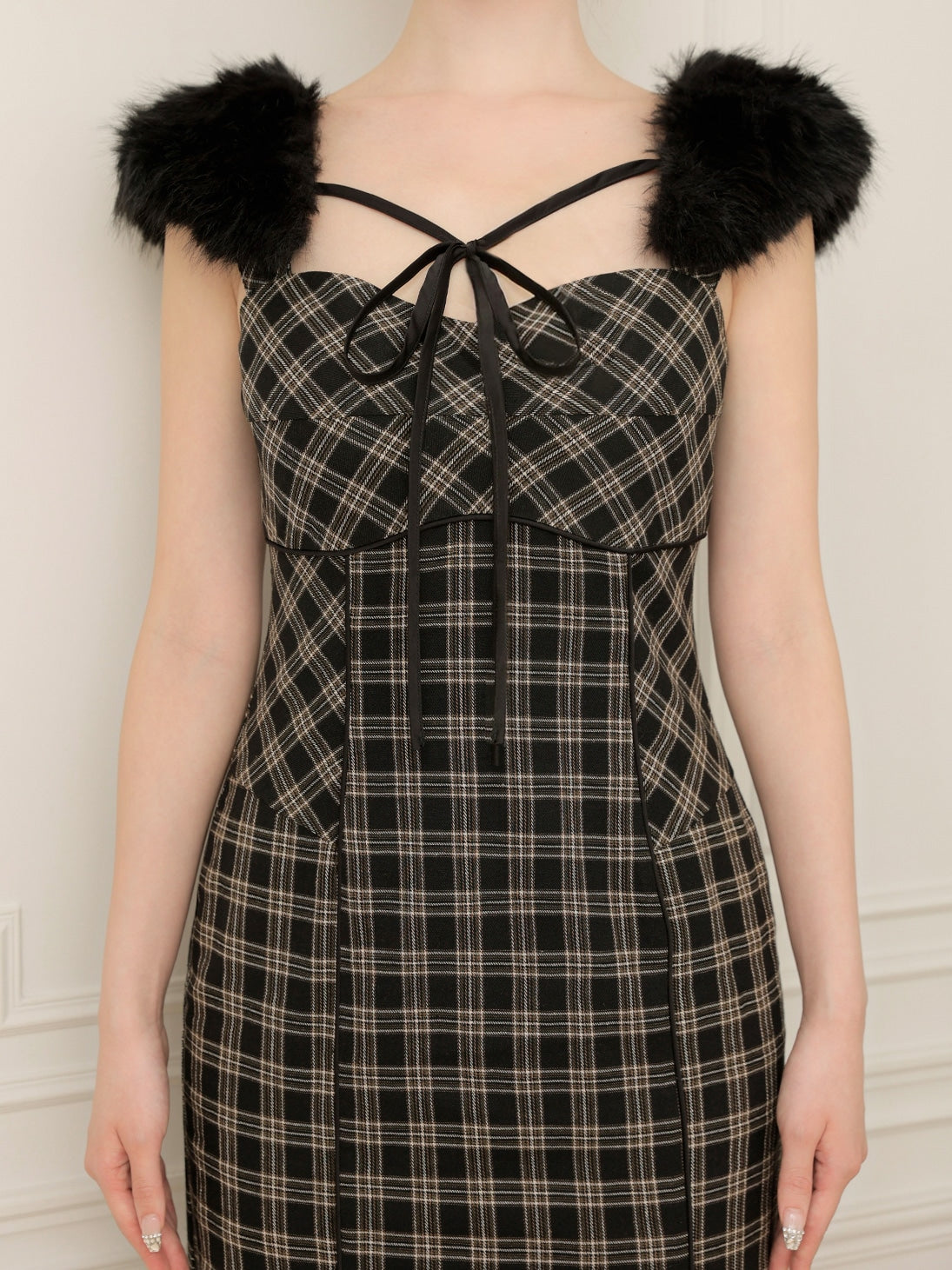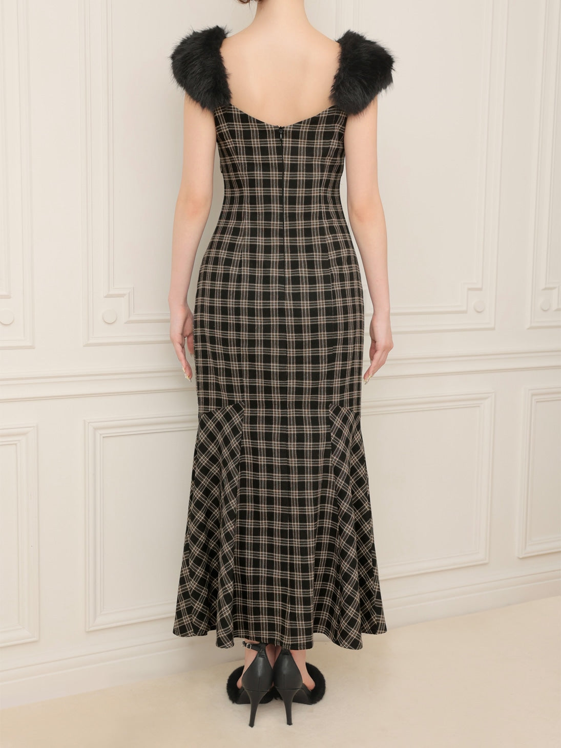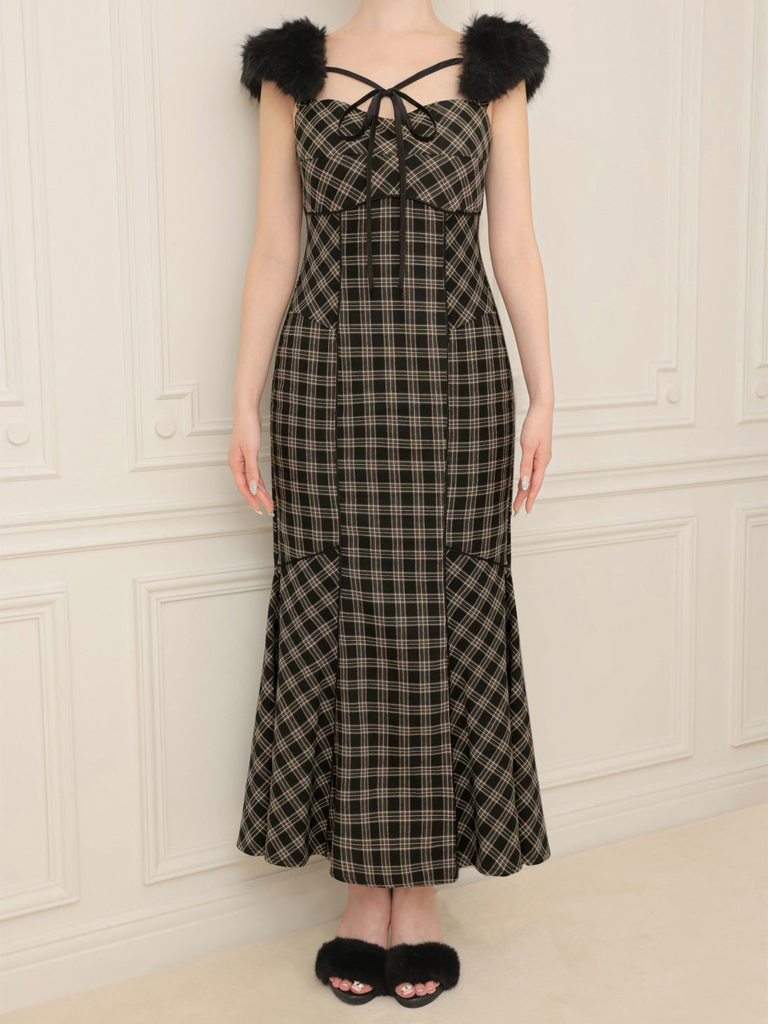 【クラシカルチェックとファーが彩るエレガントワンピース】