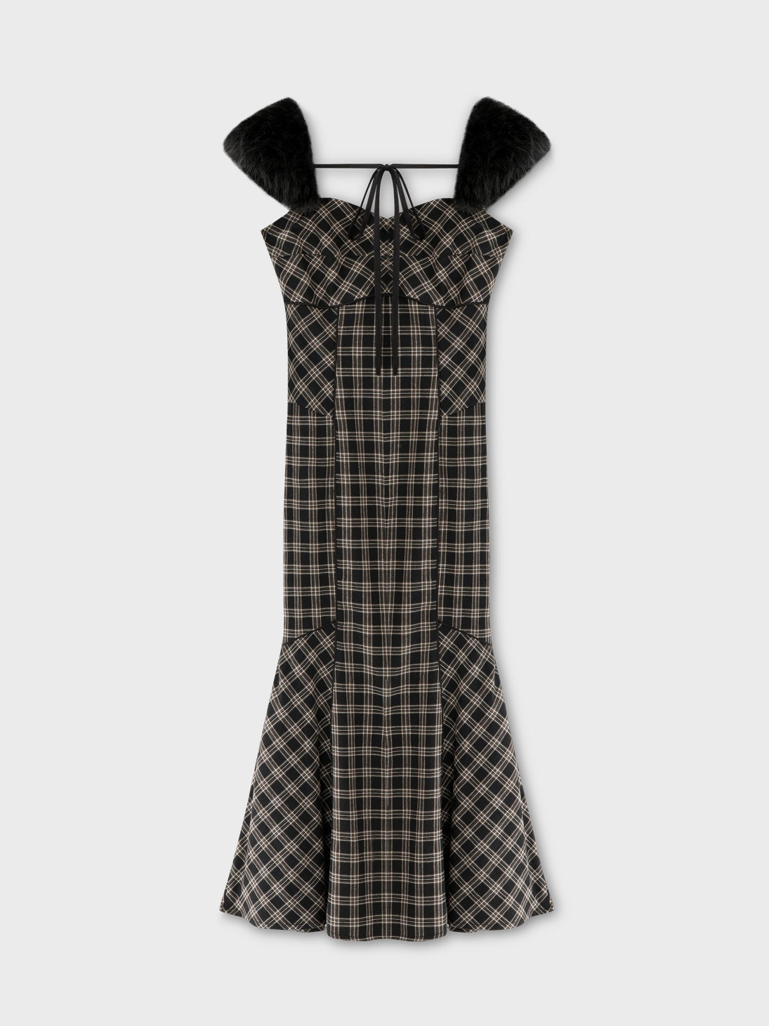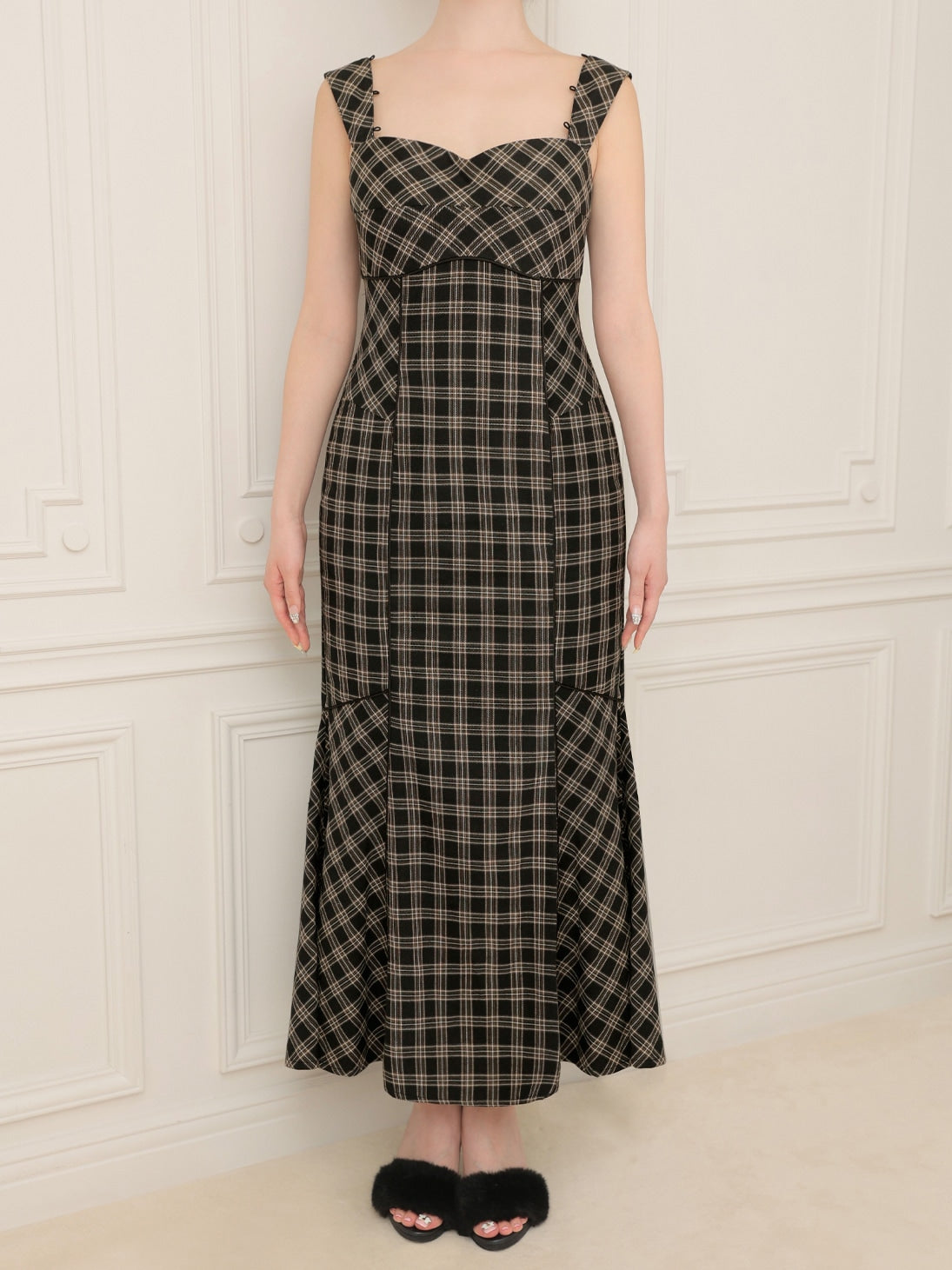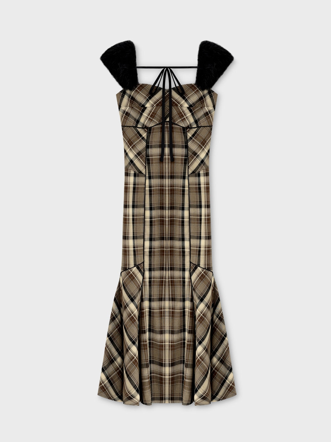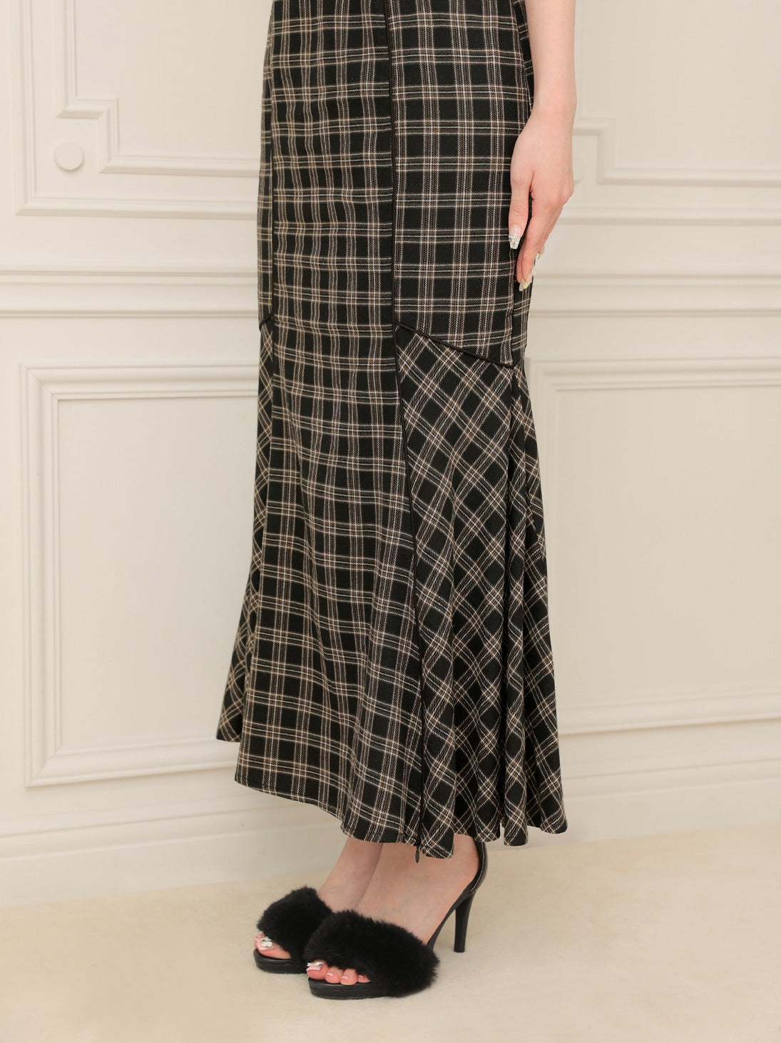 【クラシカルチェックとファーが彩るエレガントワンピース】