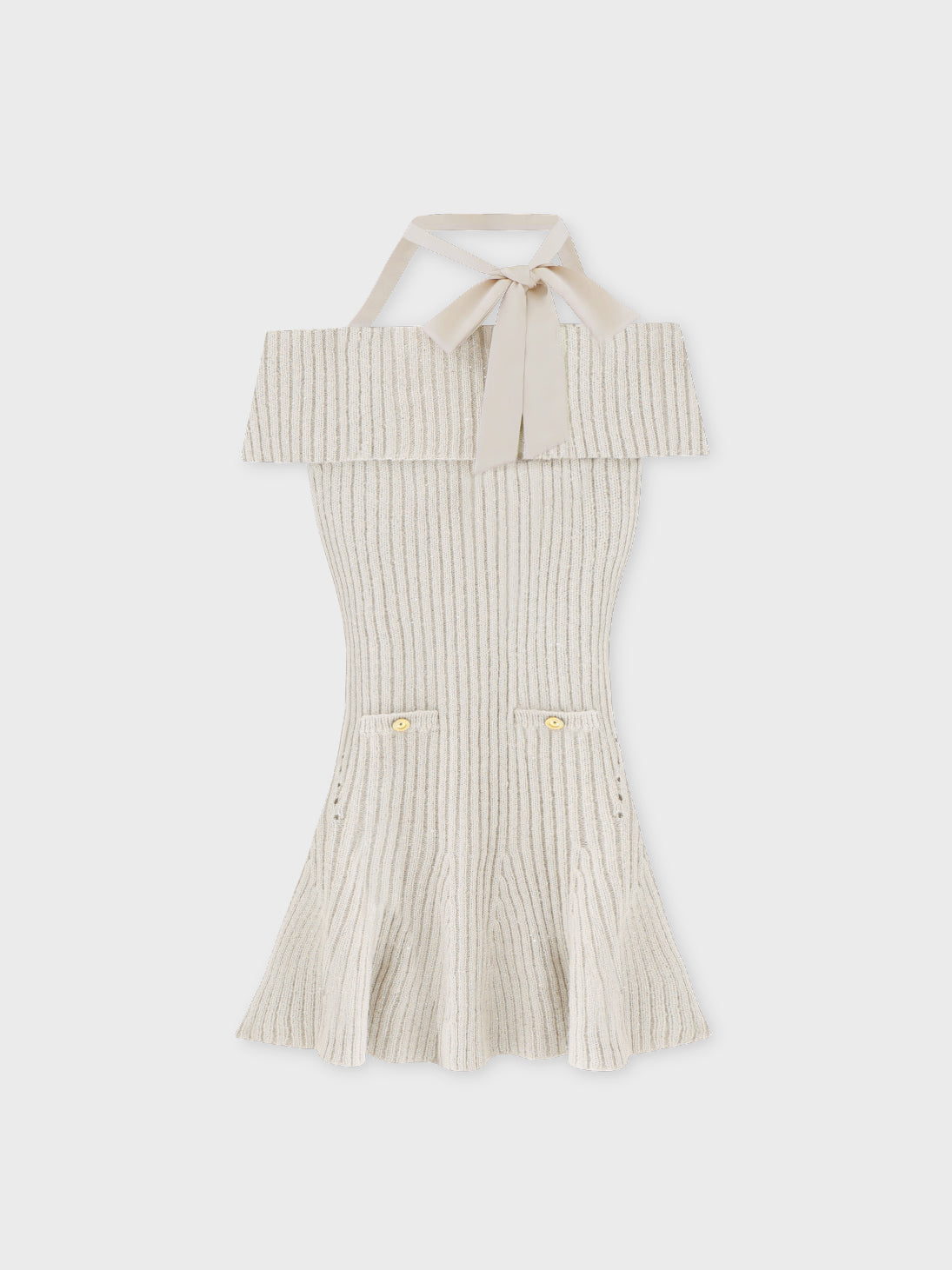 オフショルダー×リボンタイの組み合わせが視線を引きつけるニットワンピース。