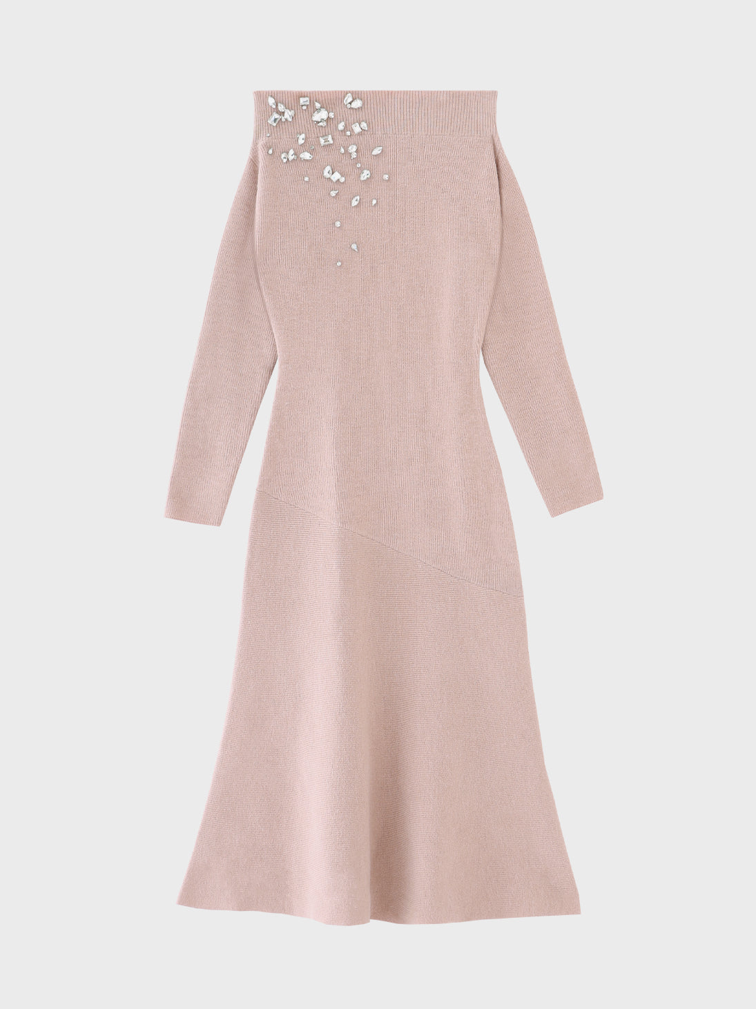 デコルテ部分に大小さまざまなビジューをあしらった、主役級のニットワンピース。