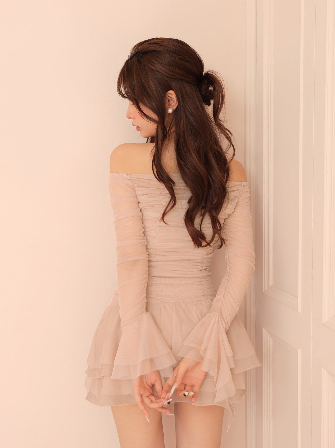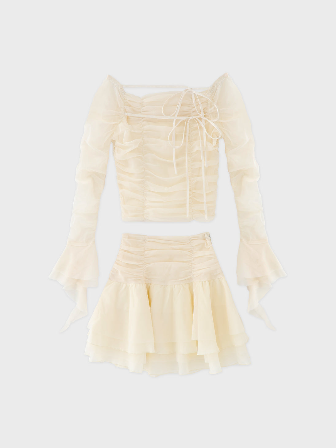 トレンドのバレエコアを感じさせる、繊細なシフォンメッシュで仕立てたセットアップ。