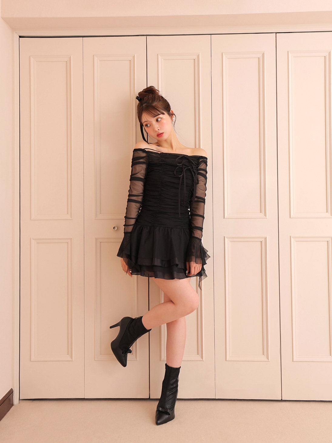 ボディラインに沿ってたっぷりと寄せたギャザーと華やかな2連リボンが視線を惹きつけます。