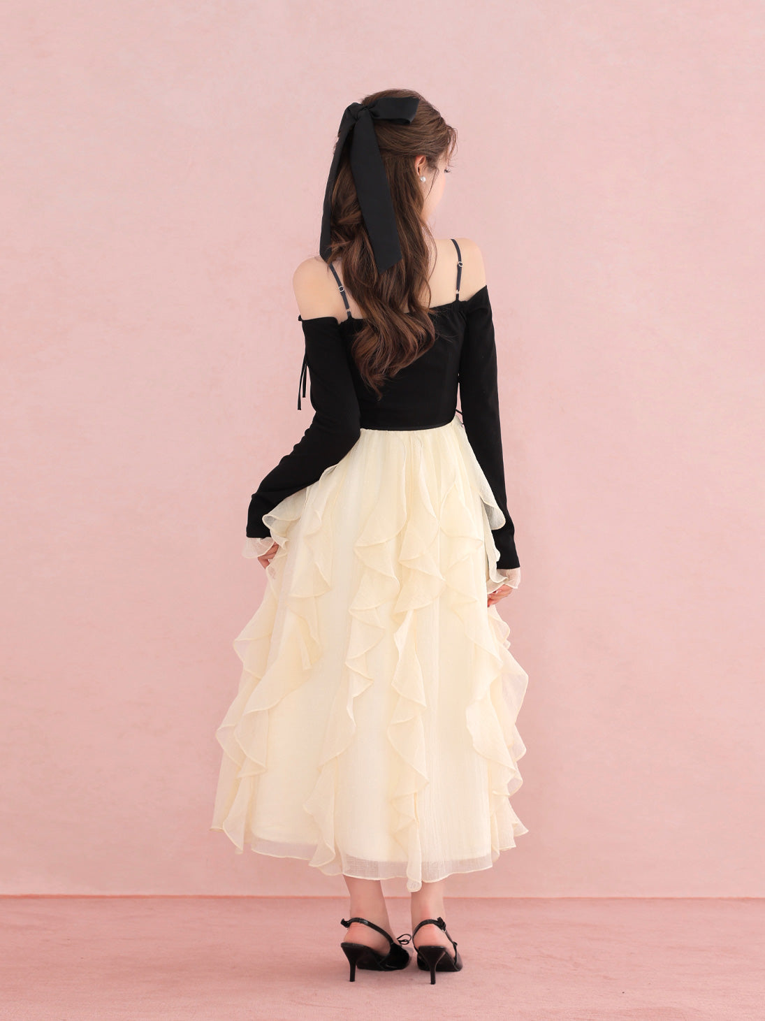 スカート部分は透明感のあるシフォン素材に、縦に流れるラッフルフリルを施し、歩くたびに華やかに揺れるデザインです。