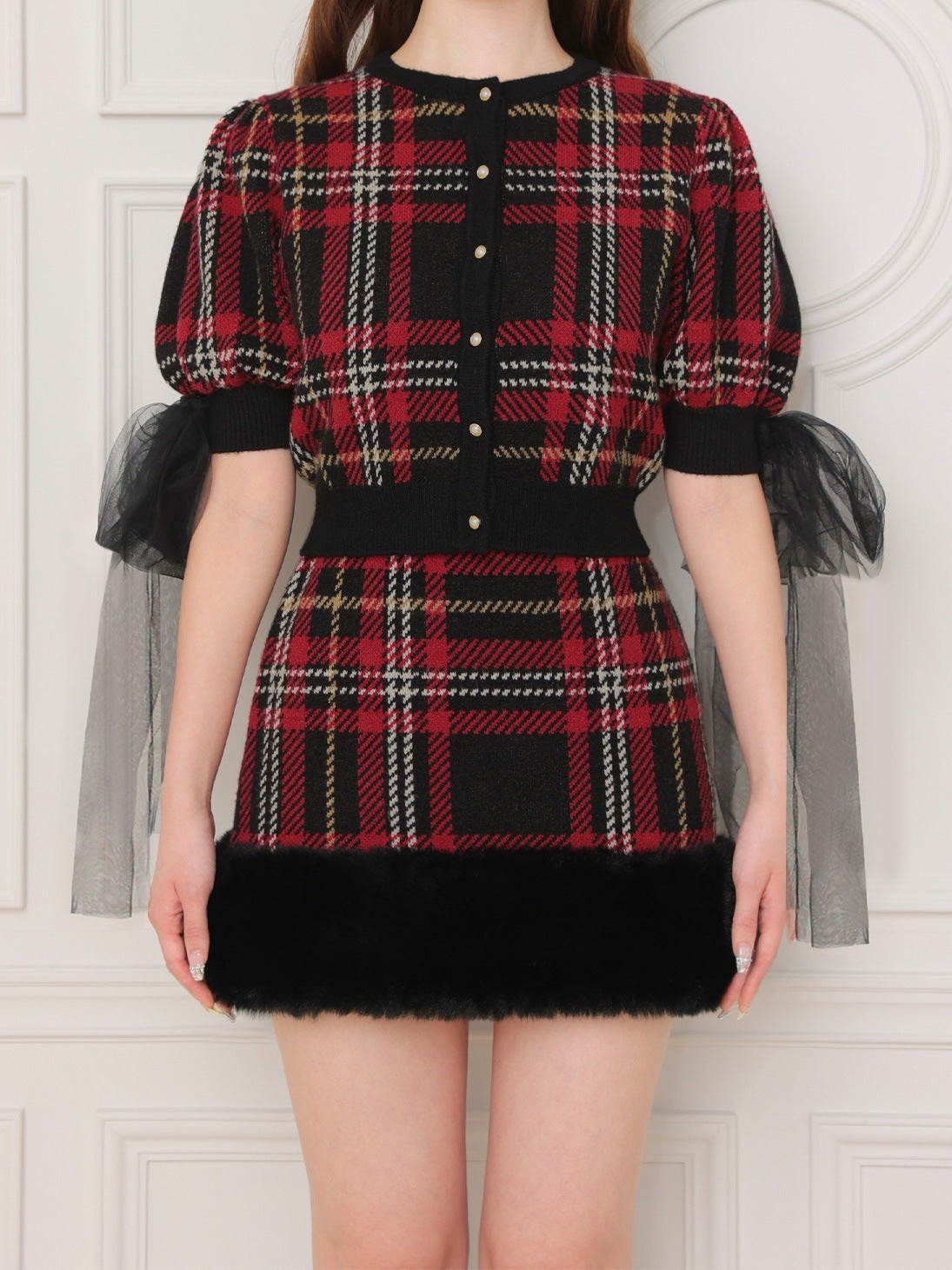柔らかなニット生地にチェク柄を織り込み、フェイクファーを組み合わせた異素材デザイン。