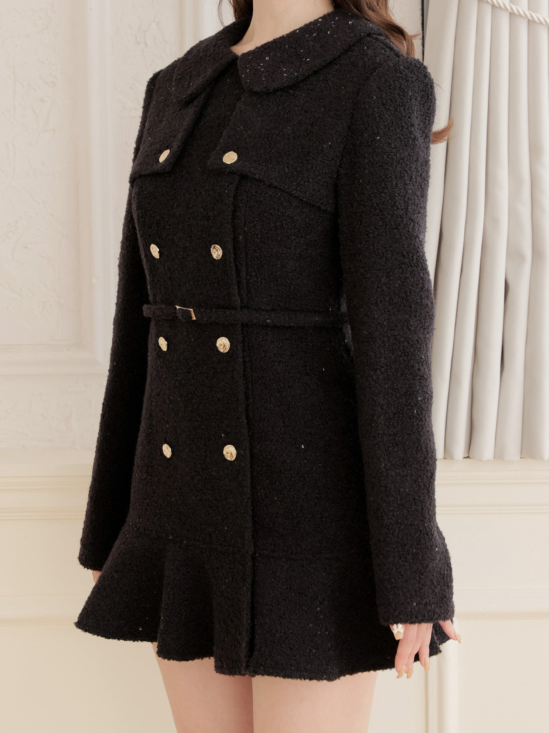 スパンコールを散りばめたブークレ生地を使用し、ふっくらとした風合いと高級感を両立。