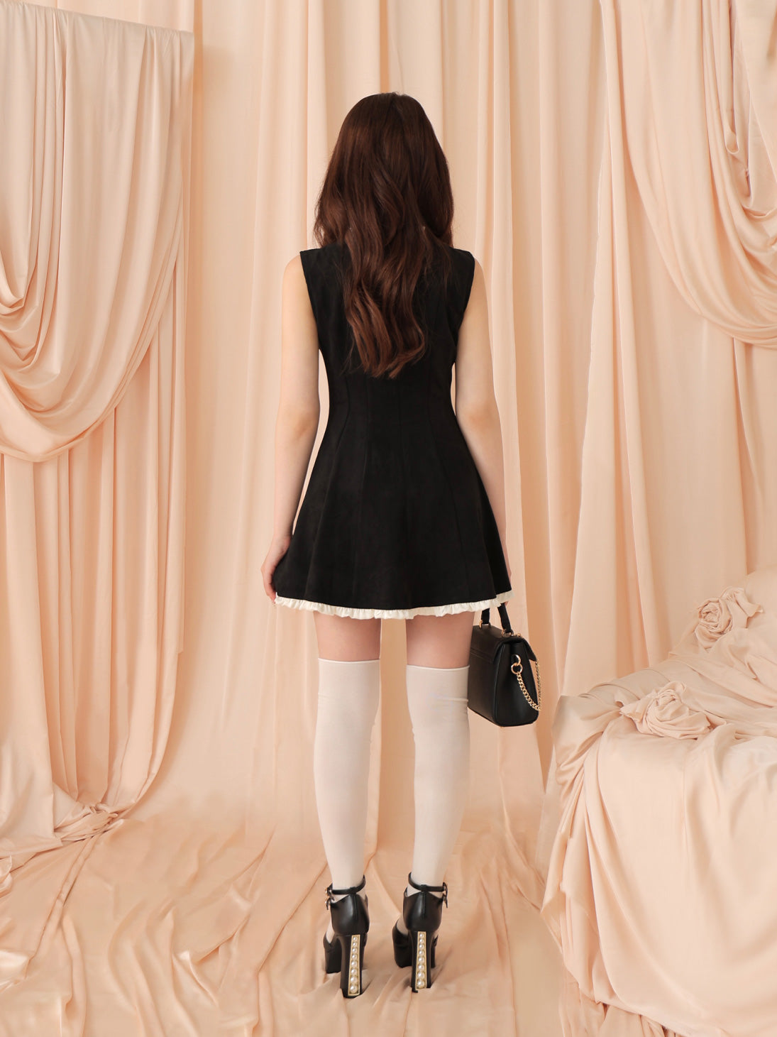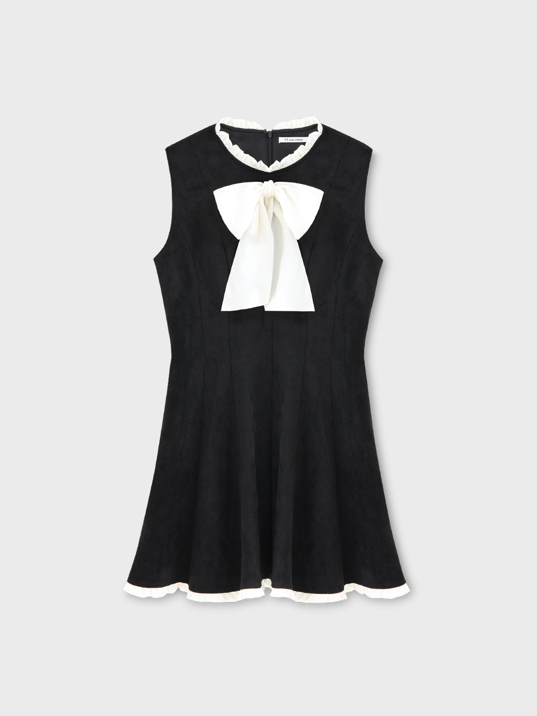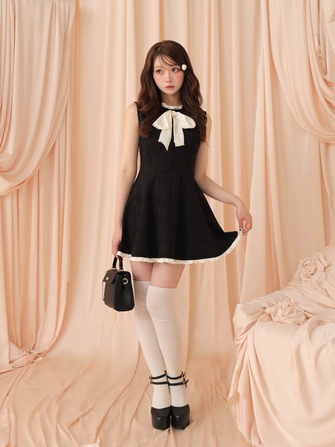 フロントにあしらったリボンや裾のフリルがさりげなくアクセントになり、大人フェミニンな印象に仕上げます。