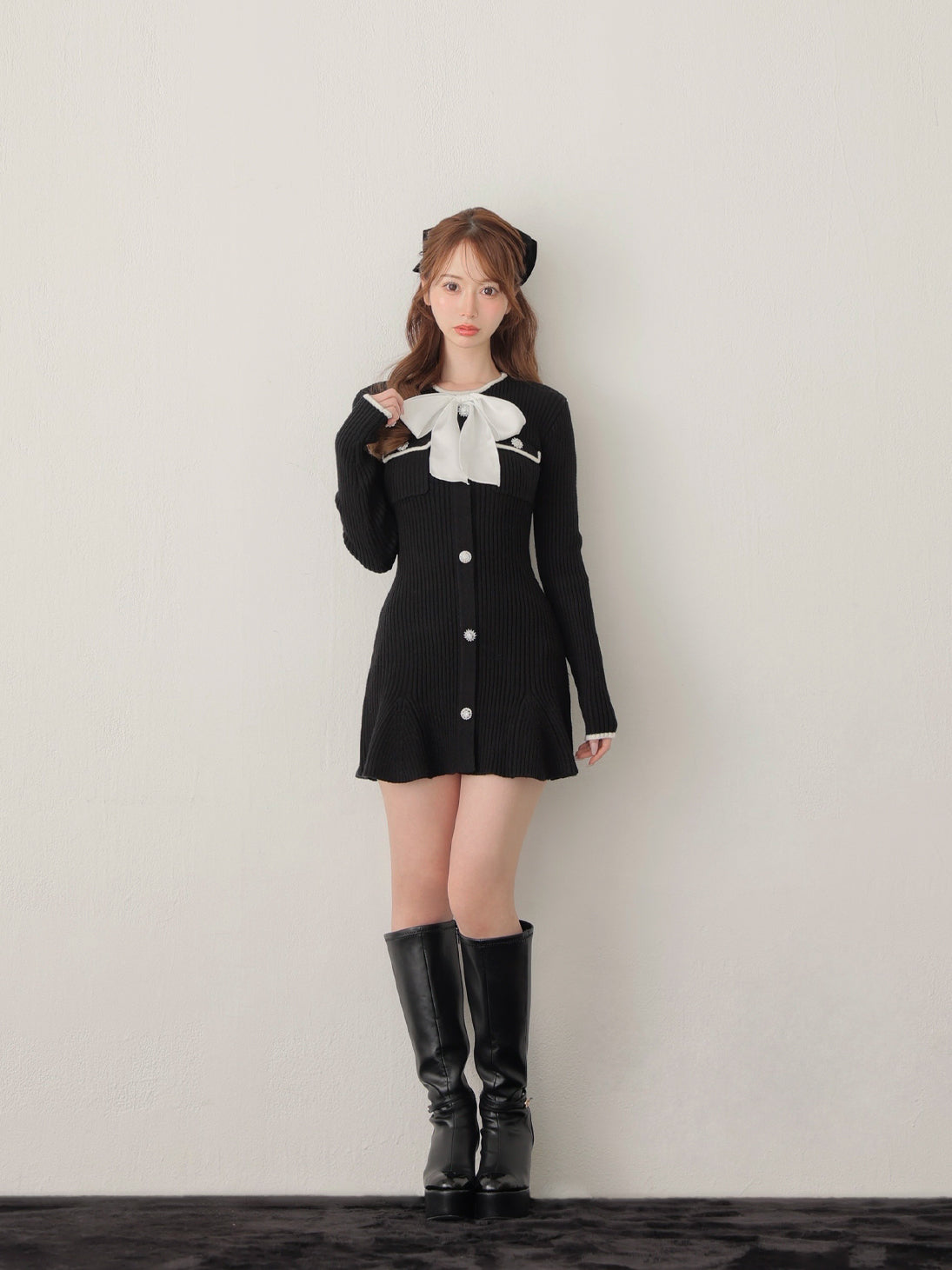 【大きめリボンが主役の、クラシカルリブニットワンピース】