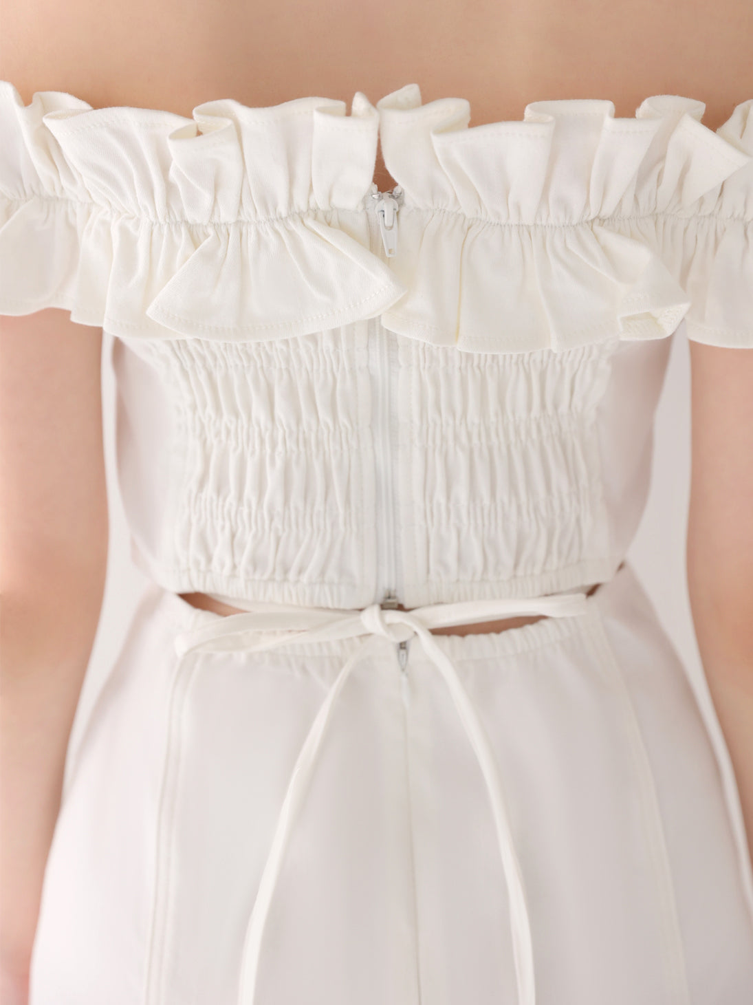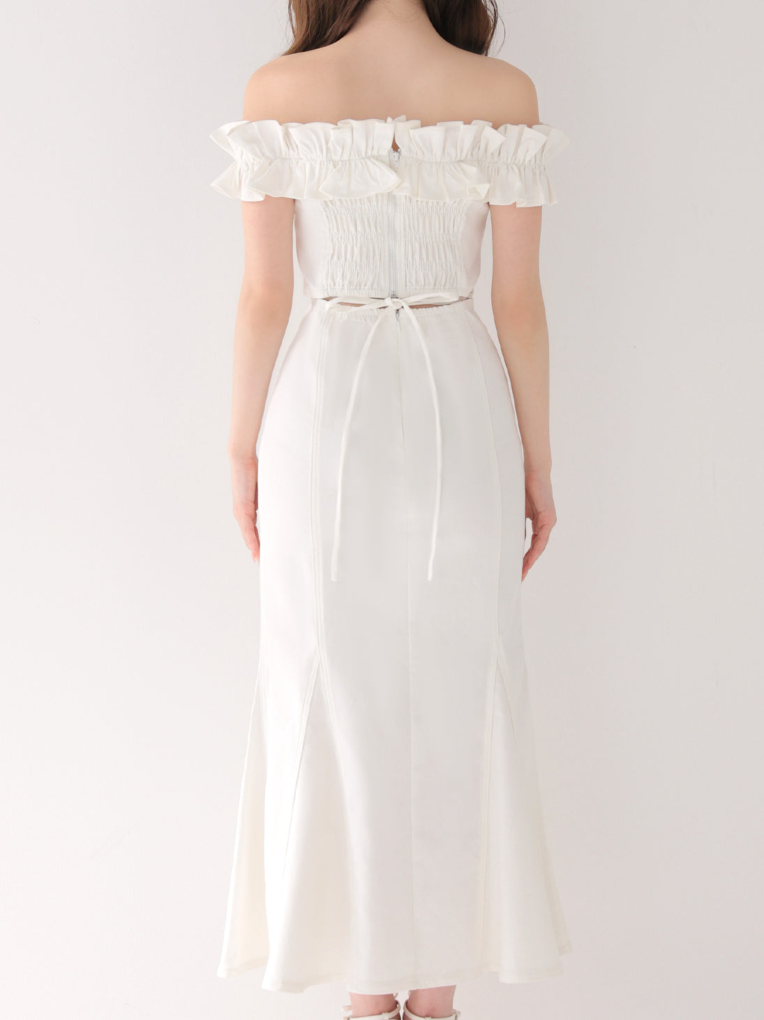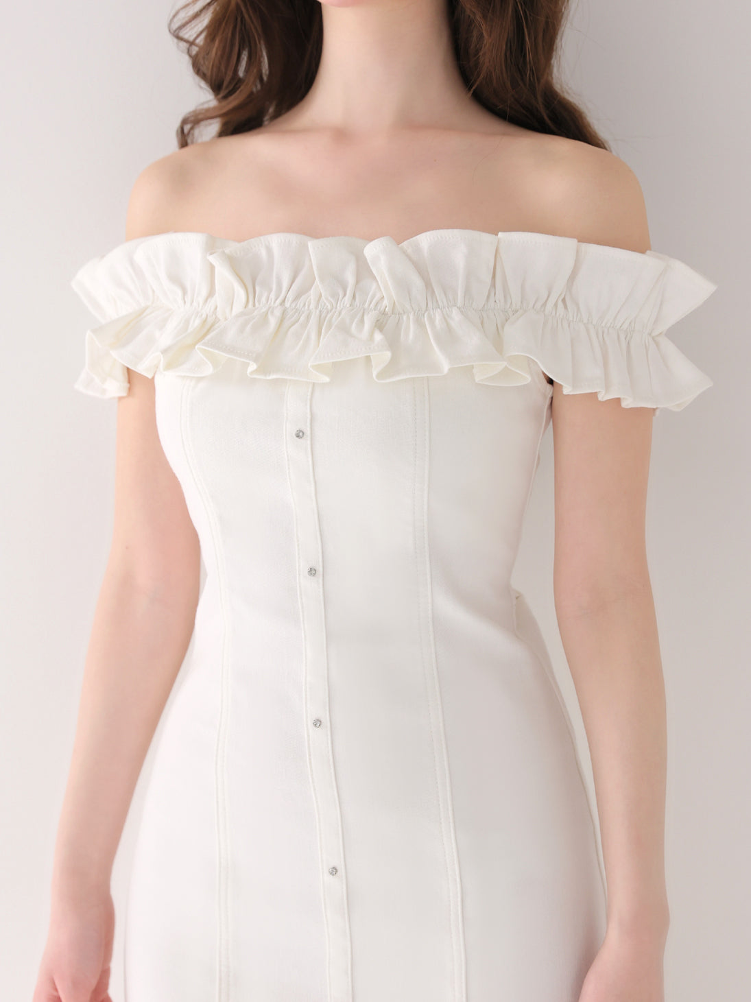 デコルテから肩にかけて一周施されたフリルが、華やかさと小顔見え効果をプラス。