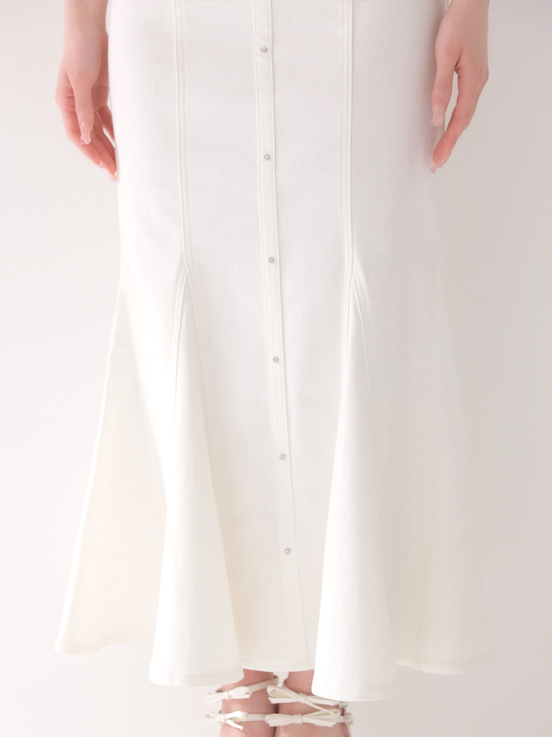 フロントには裾まで並んだビジューボタンをあしらい、視線を引きつけるアクセントに。