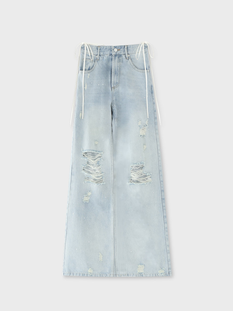 裾の両サイドにはリボン紐を施し、結び具合でシルエットの調節が可能です。