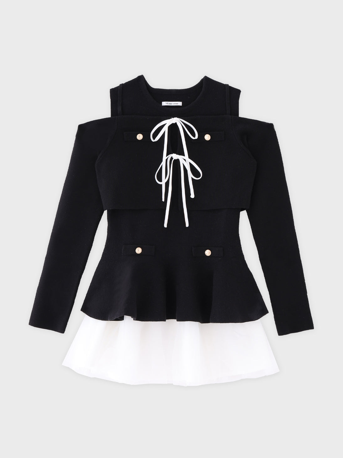 ノースリーブトップス、オフショルカーディガン、チュールスカートを組み合わせた3点セット。