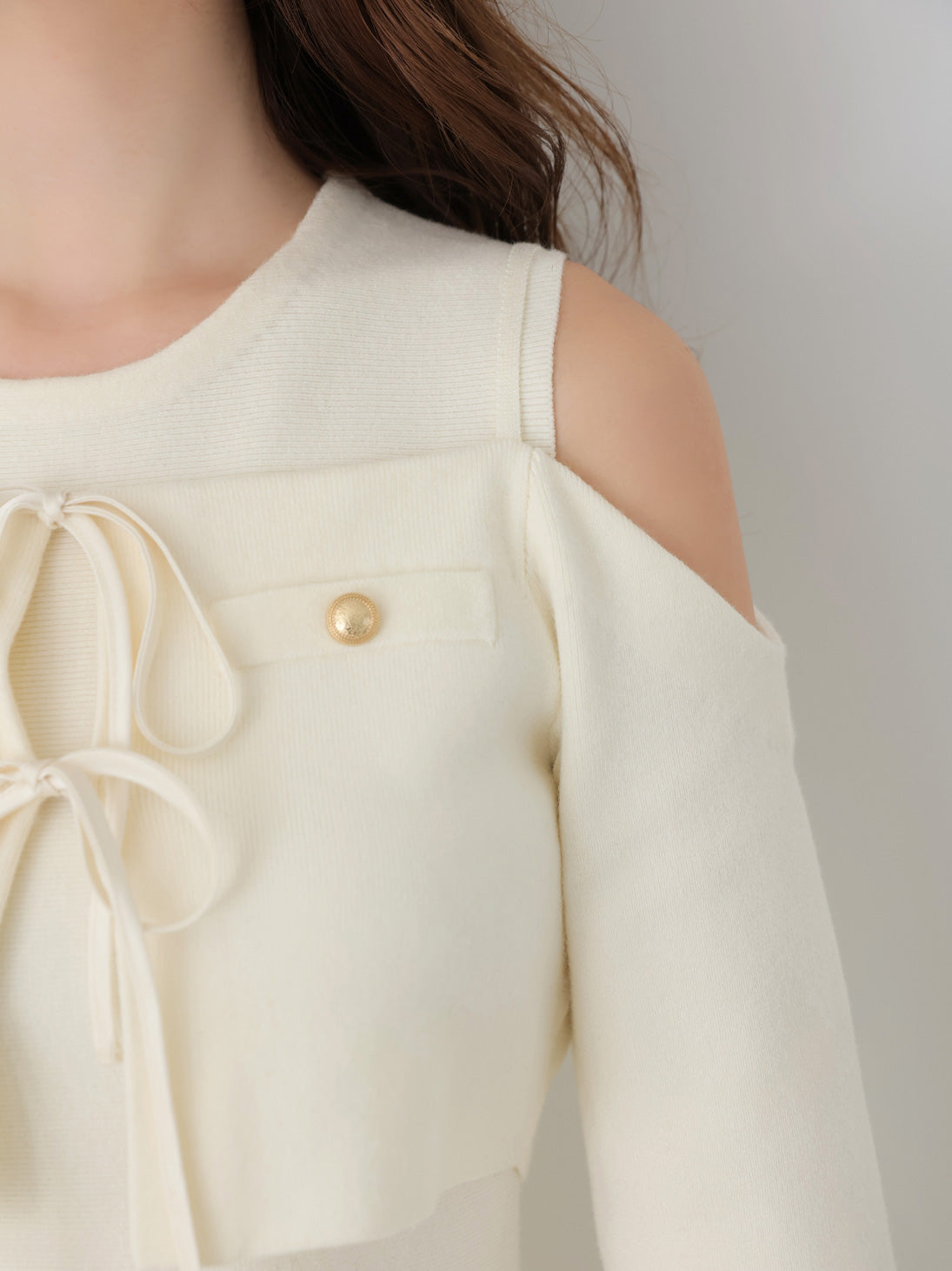 カーディガンはオフショルデザインで女性らしい抜け感を演出。コンパクトなサイズ感が上半身をすっきりと見せ、華奢な印象に。