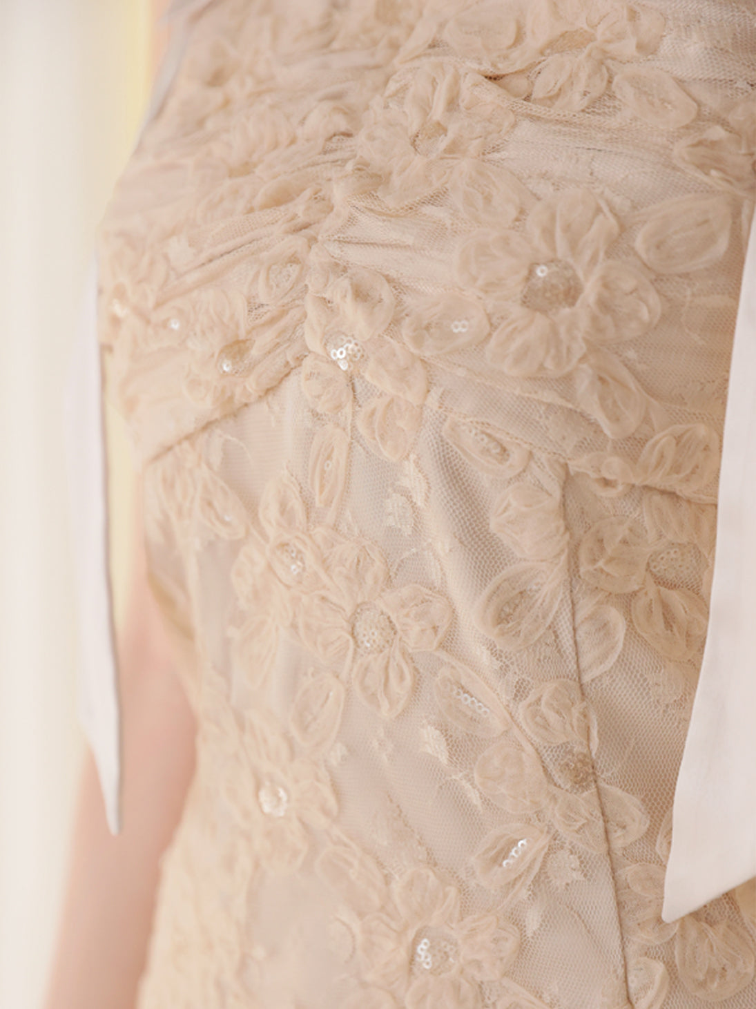 スパンコールが織り込まれた花柄チュールレースを使用。