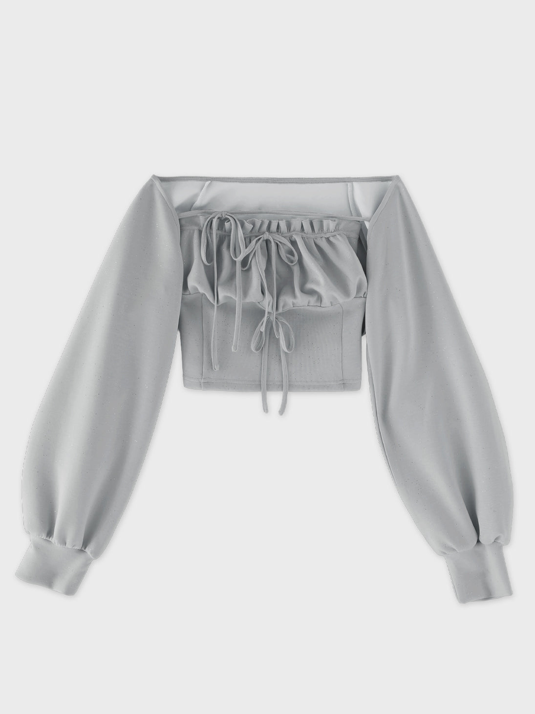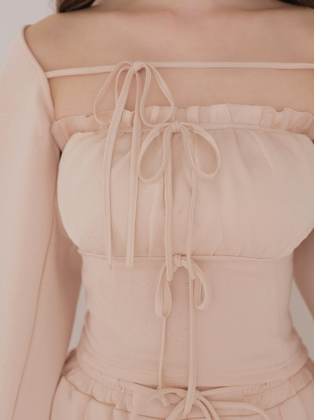 トップスのベア部分は、上端にフリルをあしらい、バスト部分にはギャザーを寄せて女性らしい立体感を演出。